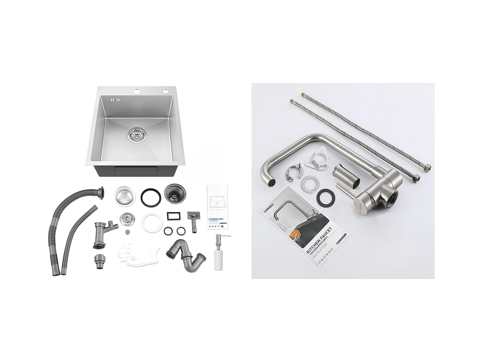 Aanrecht 1Bak Zilver,44*49*20 CM,metZeepdispenser, RVS + 360° Draaibare Keukenkraan Uittrekbare Handdouche