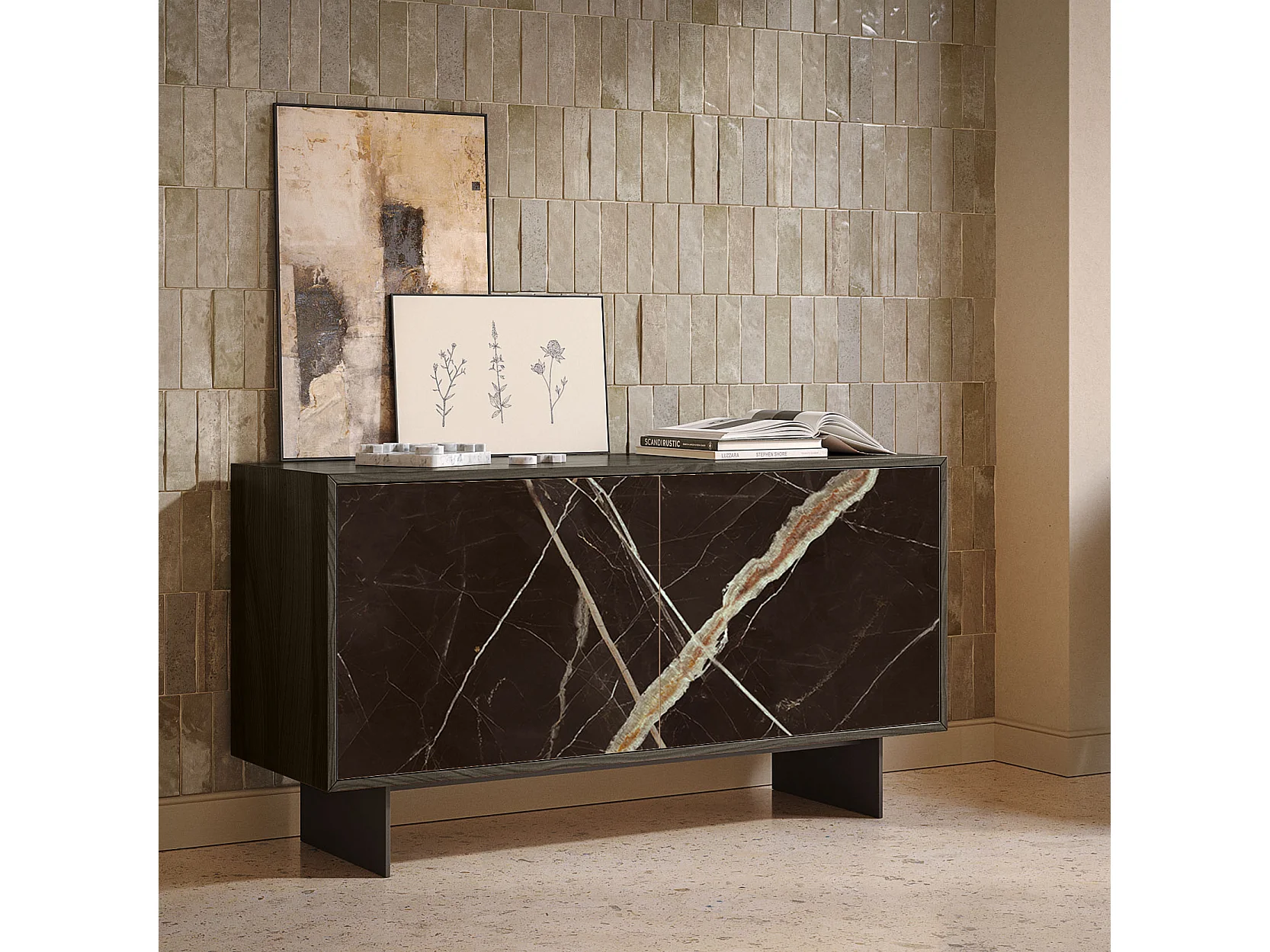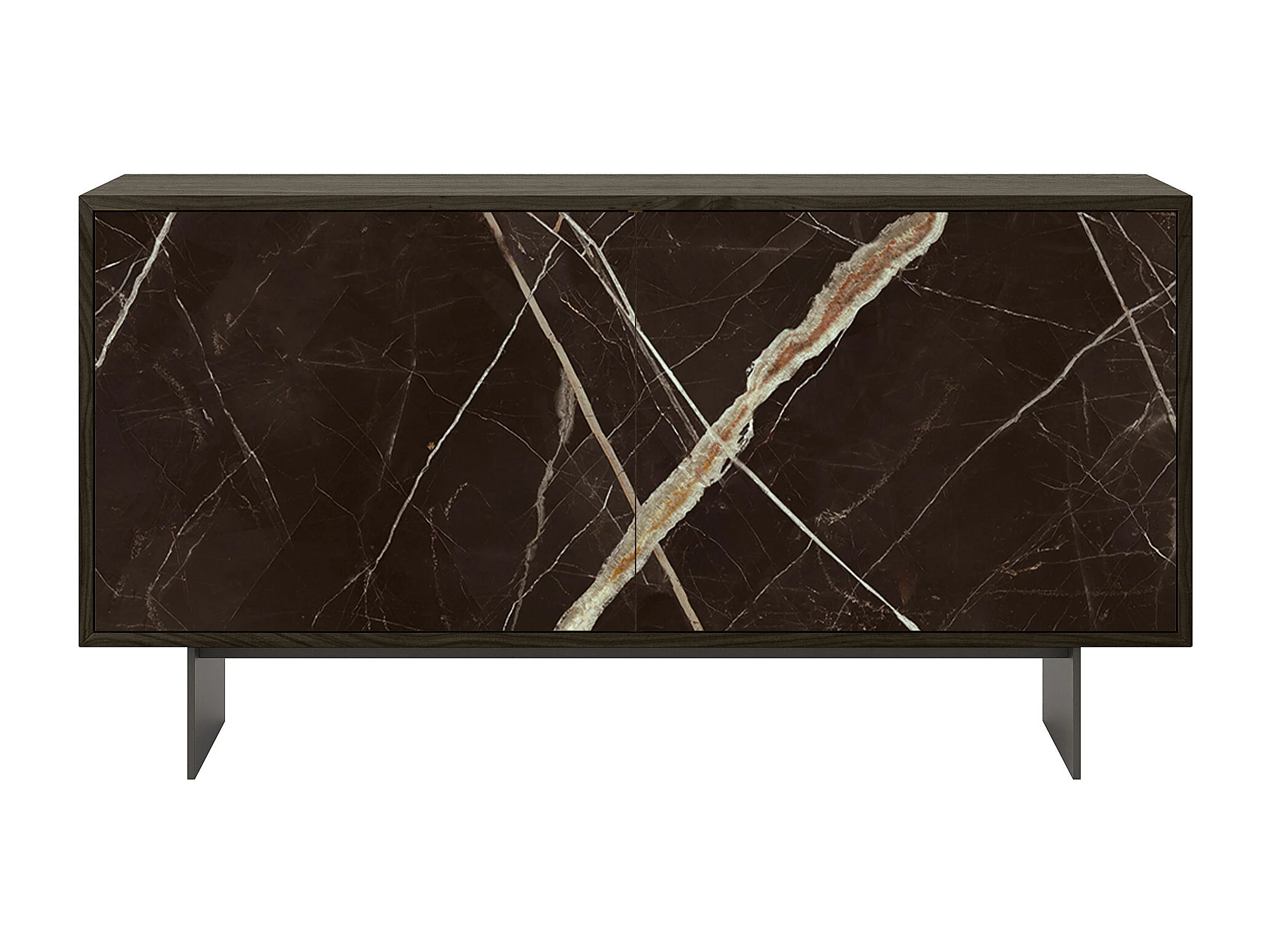 Aurea dressoir met 2 deuren - donker eikenhout gebouw, antracietgrijs, calcatta zwarte glazen deur bedrukt
