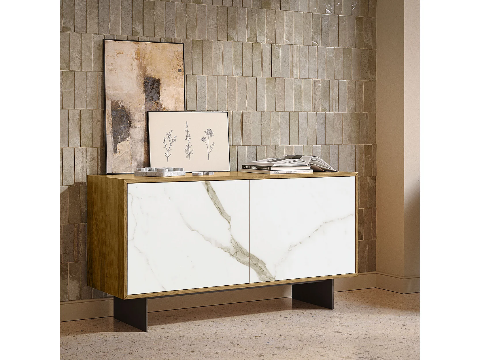Aurea dressoir met 2 deuren - natuurlijke eikenhouten constructie, antracietgrijs, glazen deur met calcatta bedrukt