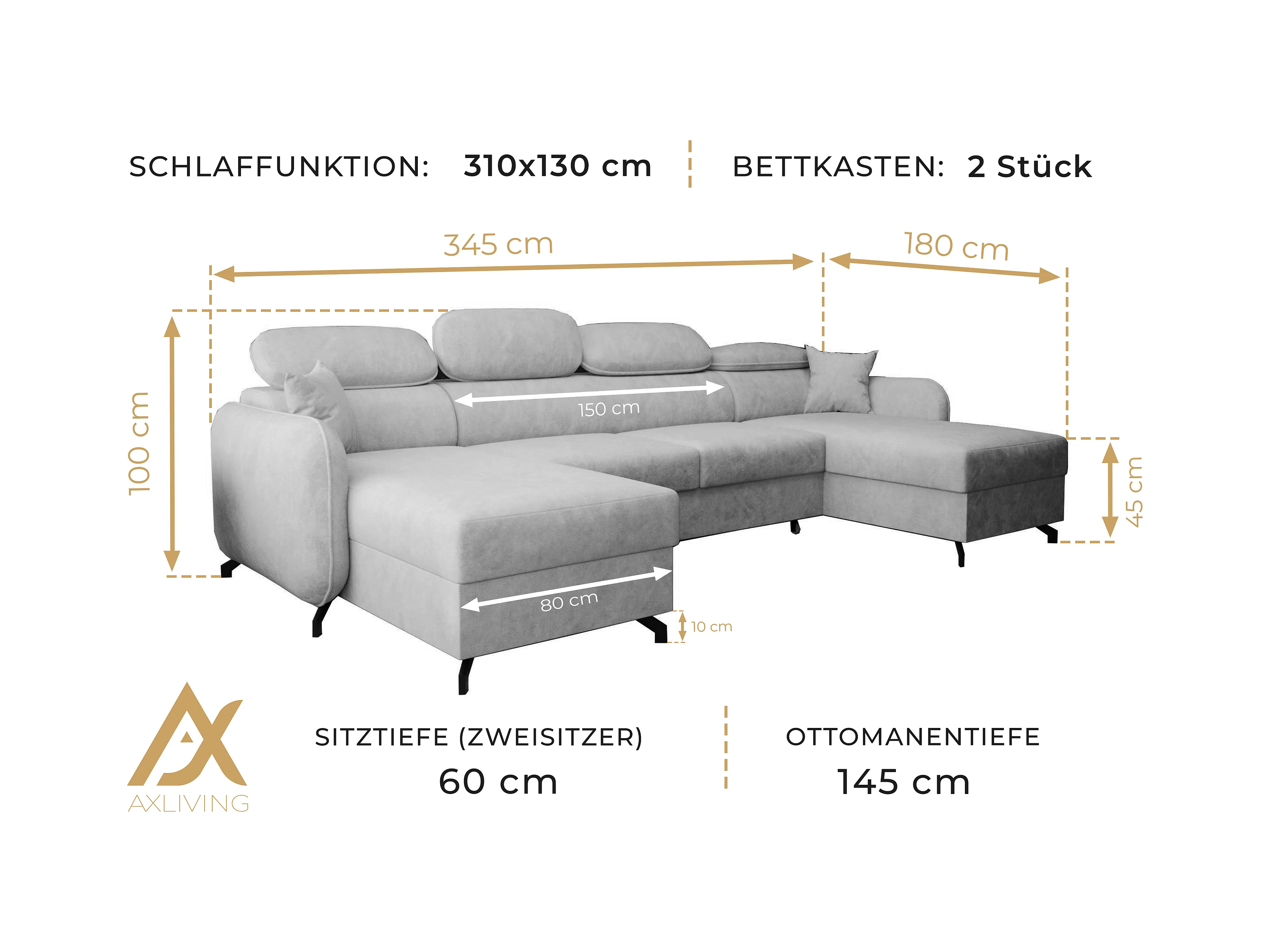 AX LIVING Hoekbank U vorm Ribella 345 cm in Amber met Bedfunctie