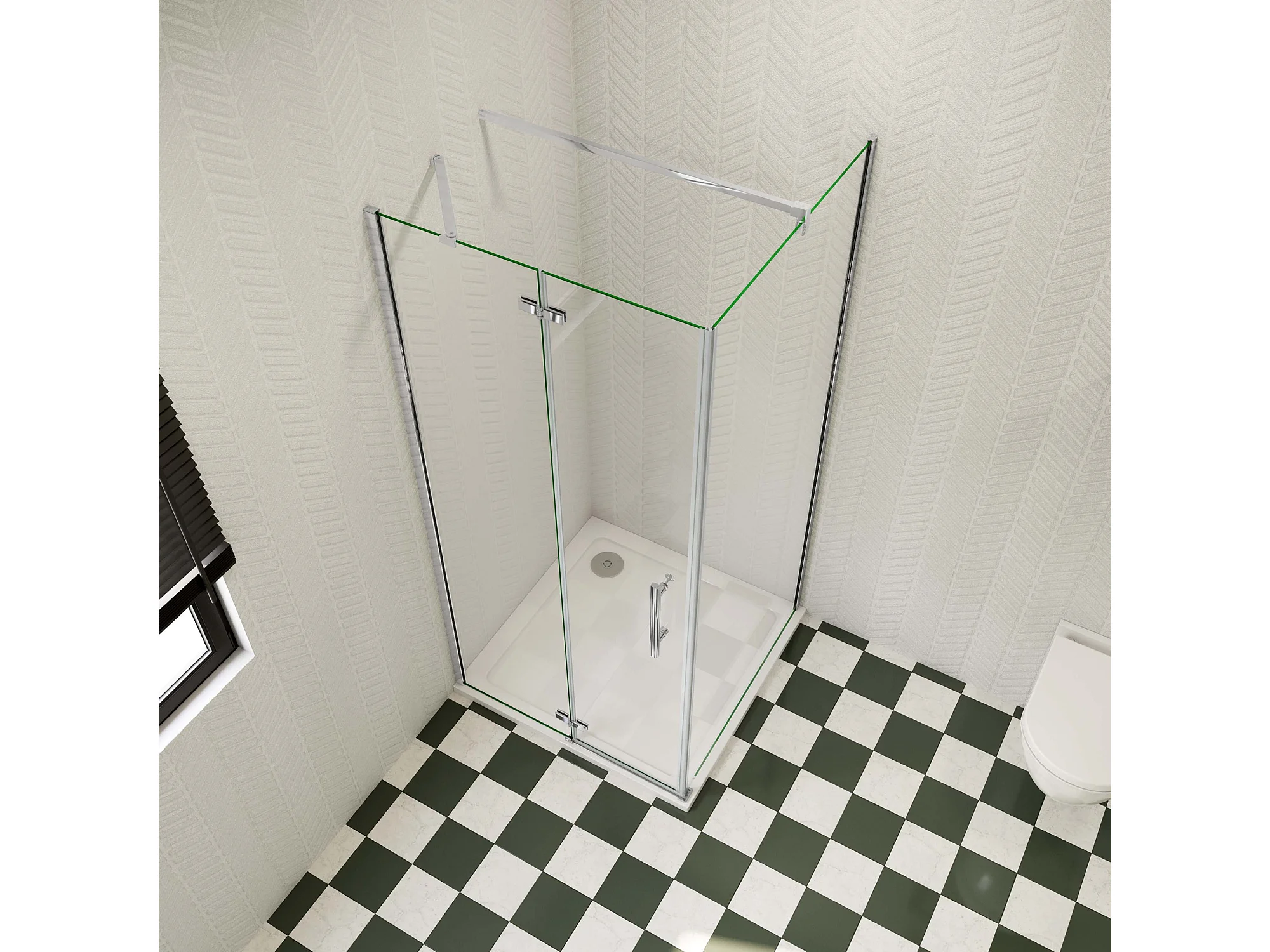 B:100xD:100xH:195cm Douchecabine,draaideur + zijpanelen,6mm helder EasyClean veiligheidsglas,140cm Stabilisatorstang,glanzend chroom profiel.