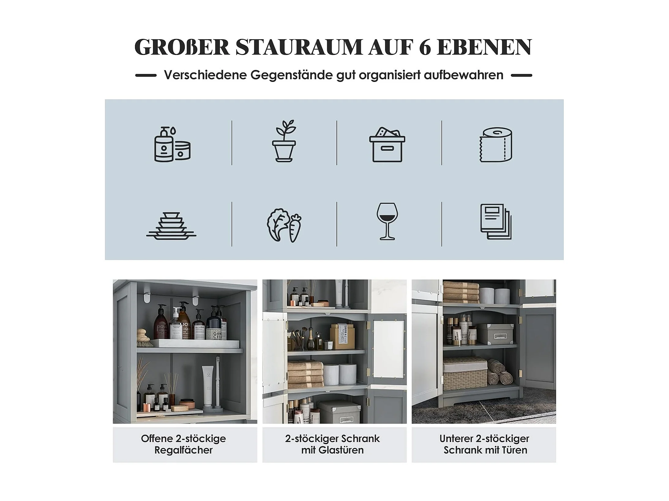 Badkamerkast met glazen deuren, 2 open vakken en verstelbare planken, hoge badkamerkast, opbergkast voor badkamer, keuken, woonkamer (grijs)VH32864