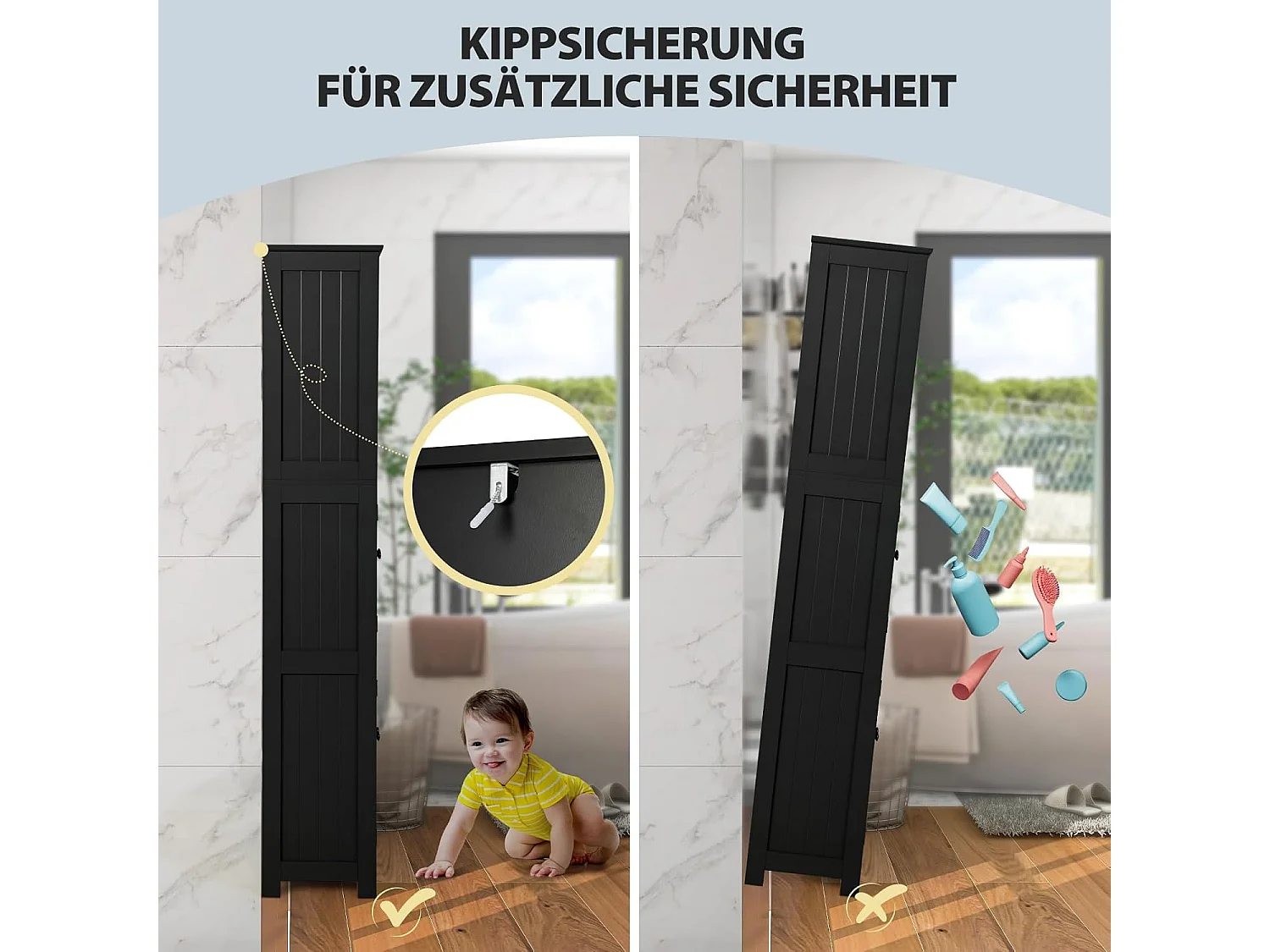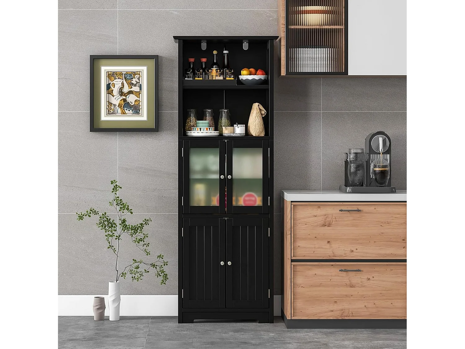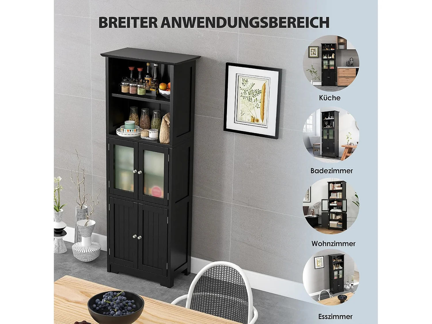 Badkamerkast met glazen deuren, 2 open vakken en verstelbare planken, hoge badkamerkast, opbergkast voor badkamer, keuken, woonkamer (zwart)VH32864