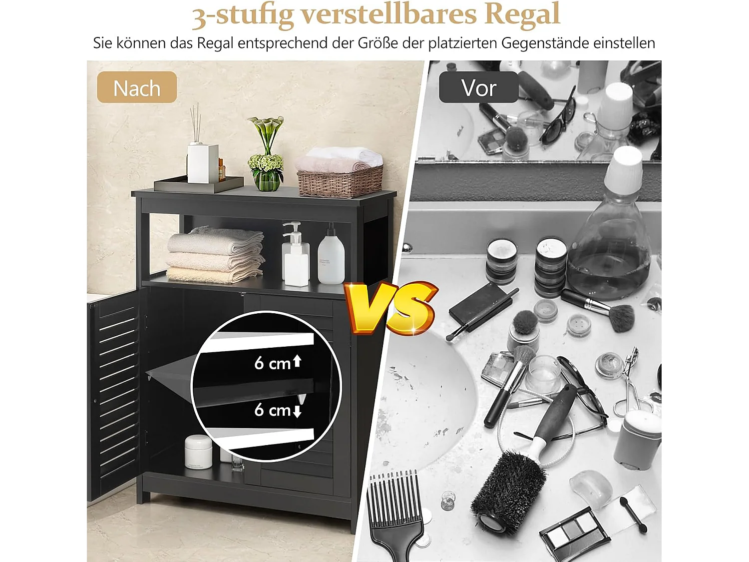 Badkamerkast, vrijstaande badkamerkast, opbergkast met 2 rolluikdeuren, keukenkast, badkamercommode van hout voor badkamer, keuken, woonkamer (zwart)TI87069
