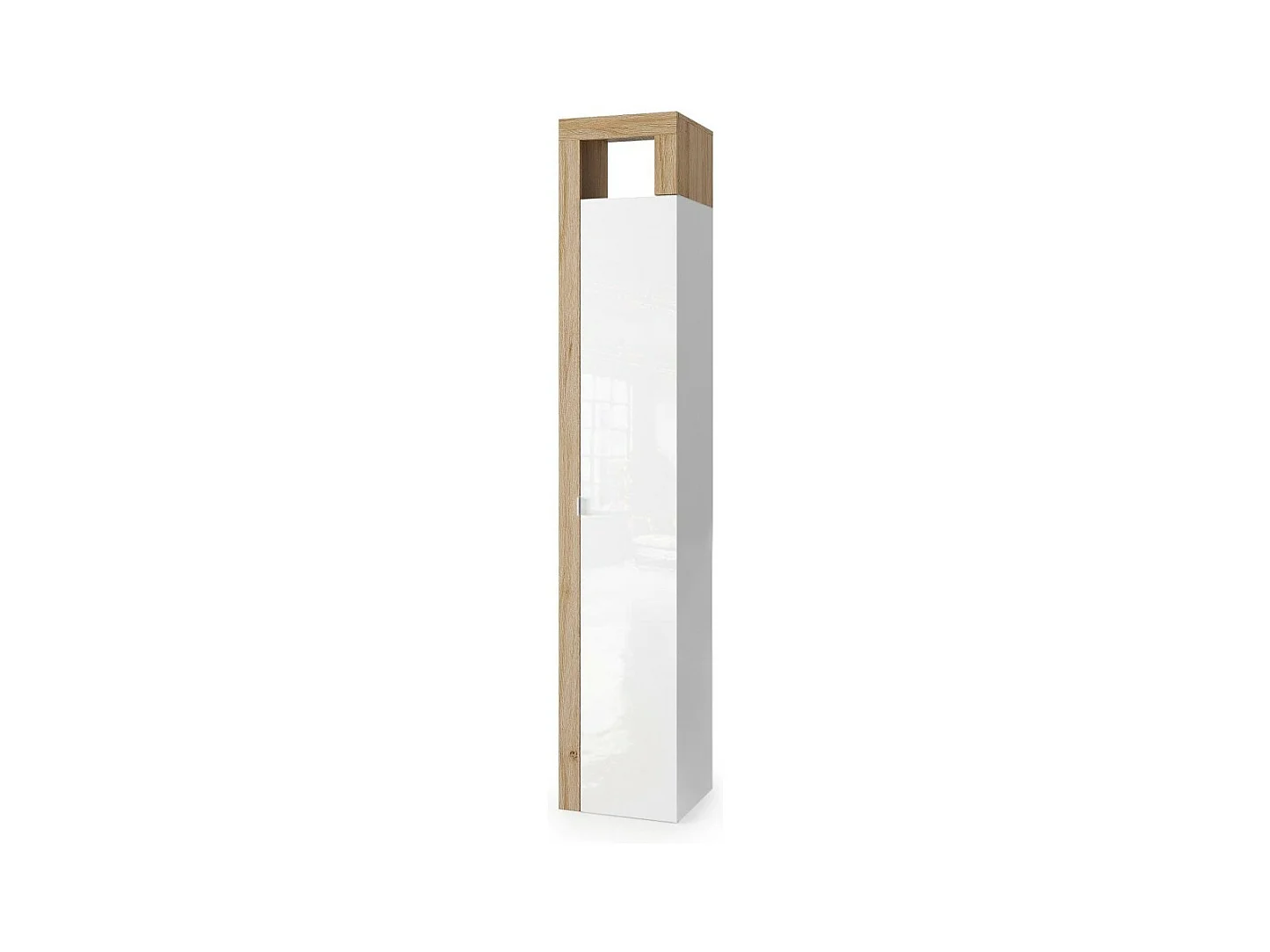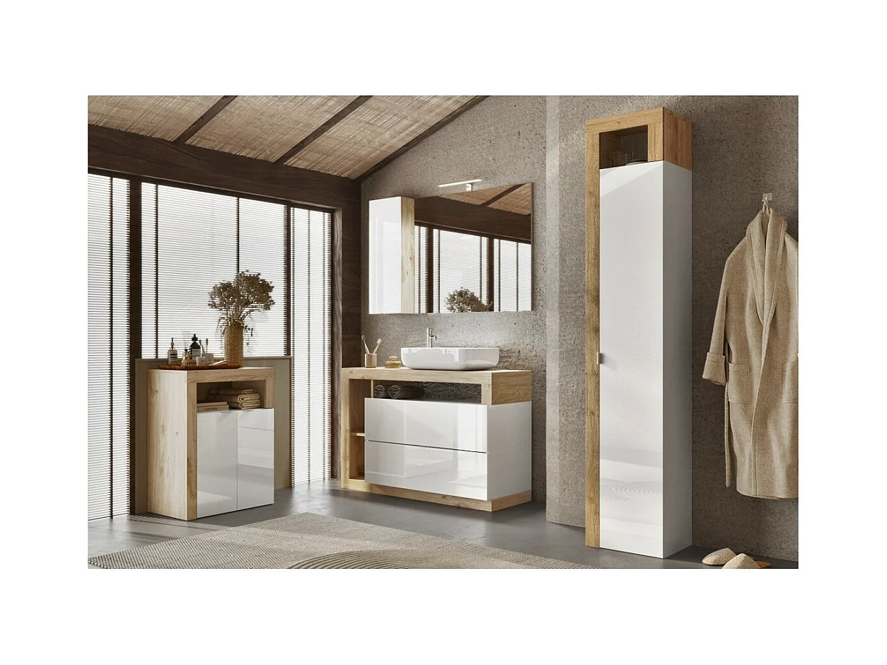 Badkamerkolom, 1 deur, 5 planken, collectie BURA. Hoogglans wit lak en licht eiken kleur.