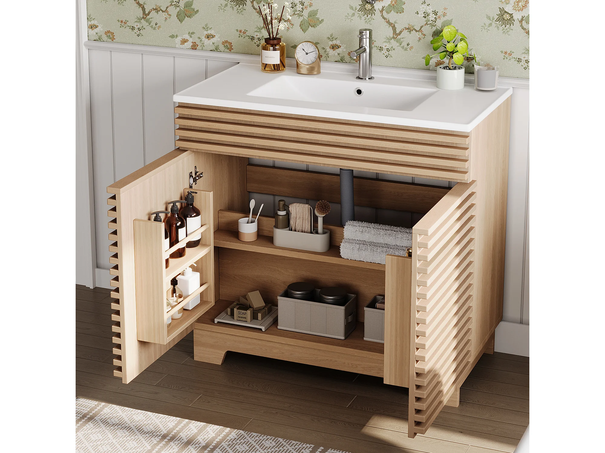 Badkamermeubel - 91 x 46 x 86,5 cm - natuurlijke afwerking - met 2 opbergdeuren + wastafel - MDF - naturel