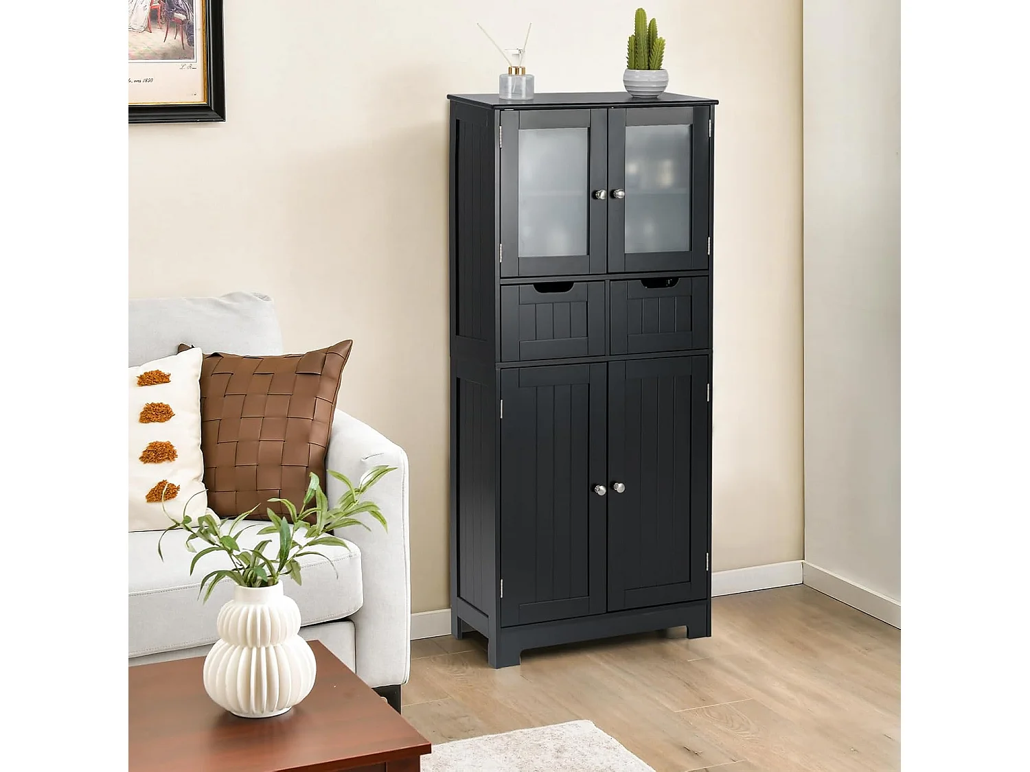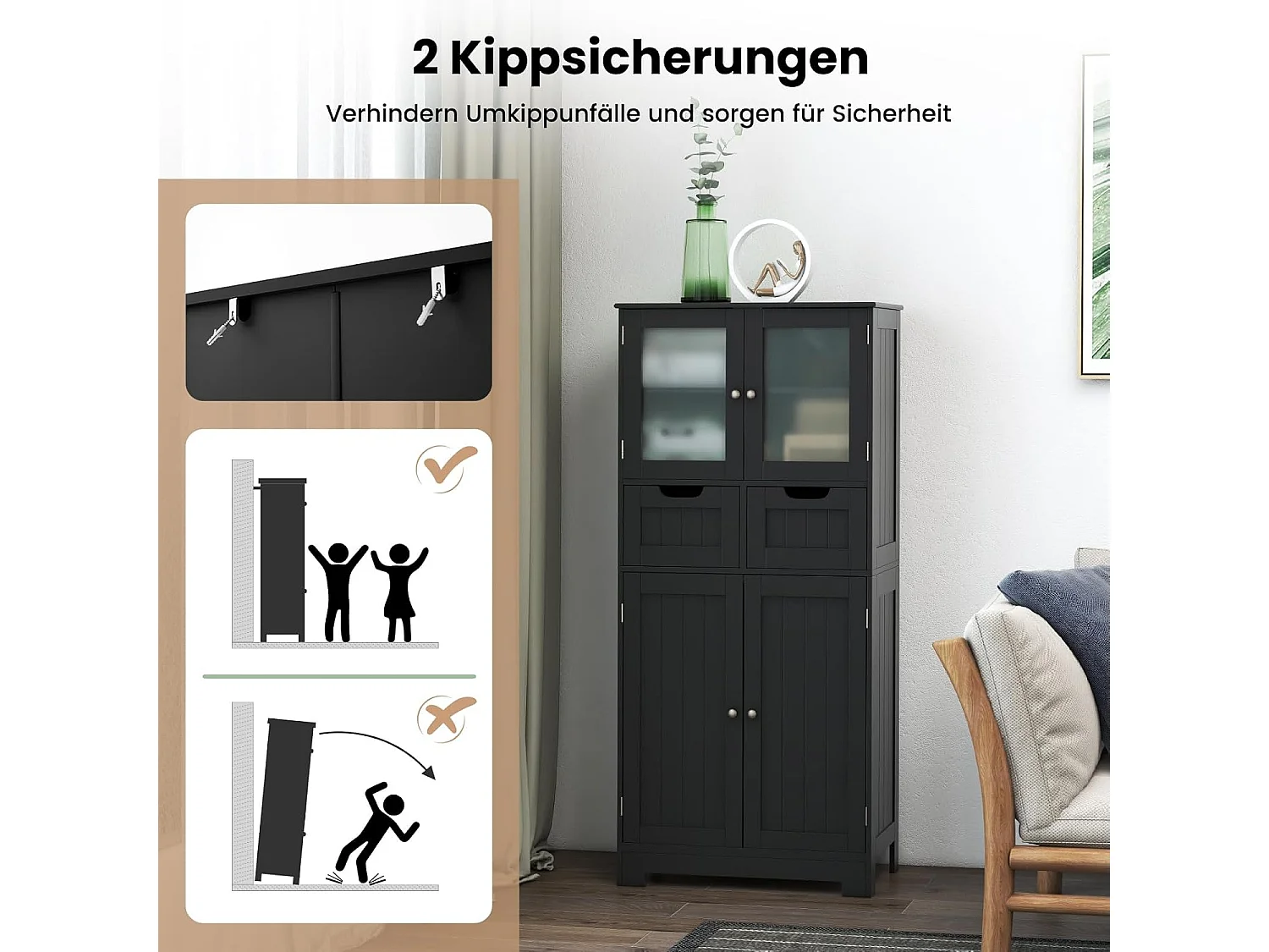Badkamerkast met glazen deuren, 2 open vakken en verstelbare planken, hoge badkamerkast, opbergkast voor badkamer, keuken, woonkamer (zwart)VH32864