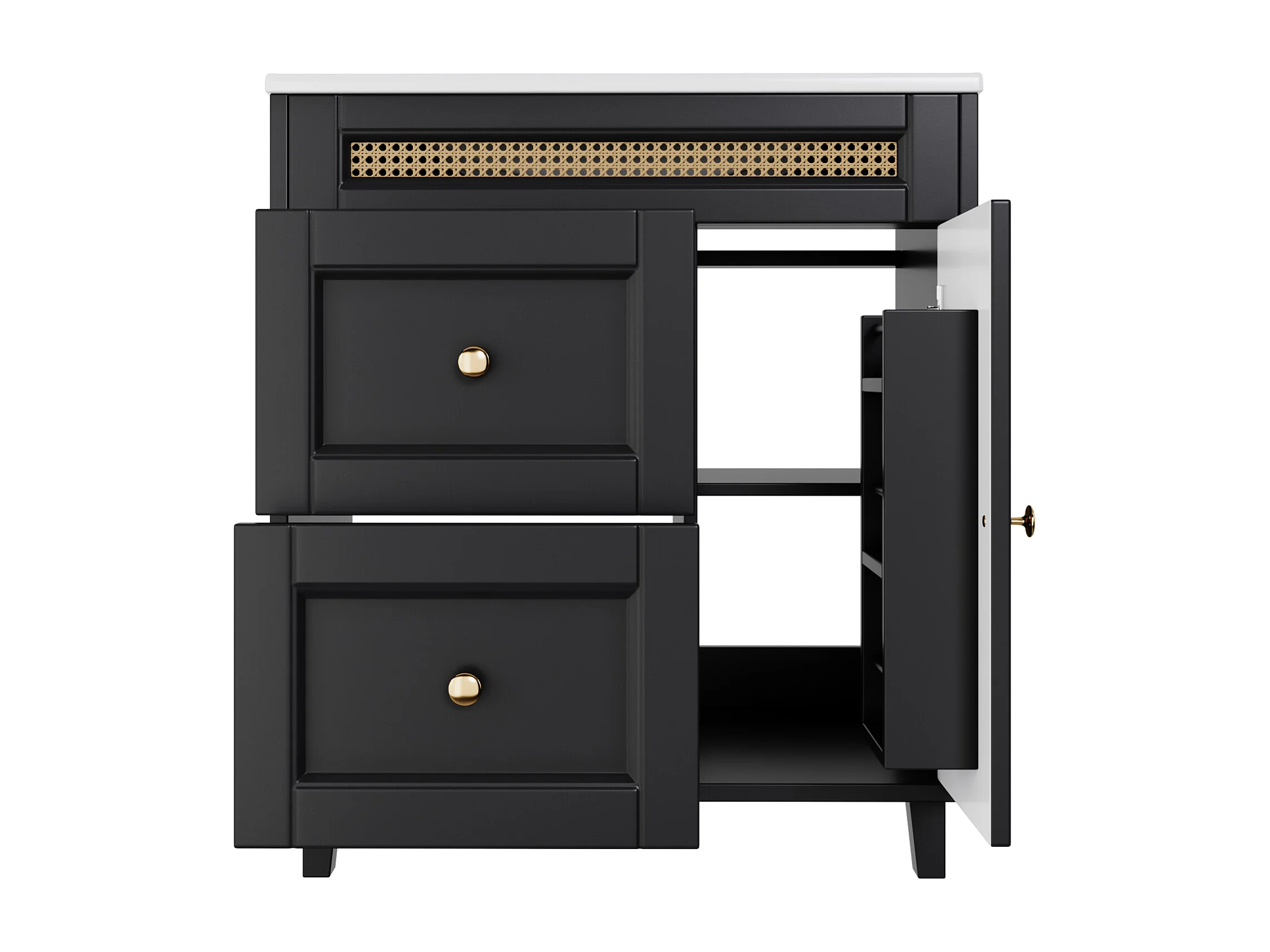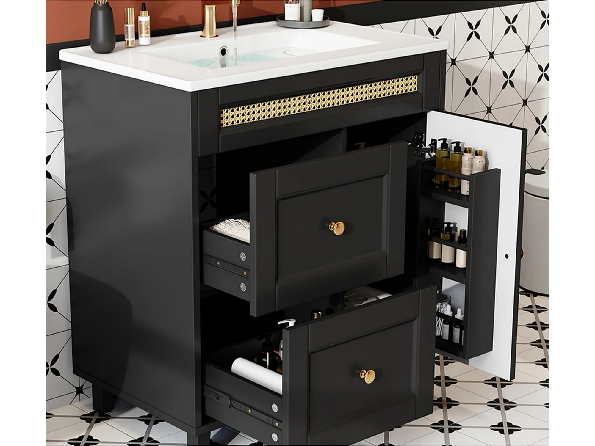 Badkamermeubel op poten 76x46x86,5 cm - Keramieken wastafel - 2 lades en 1 deur - Zwart