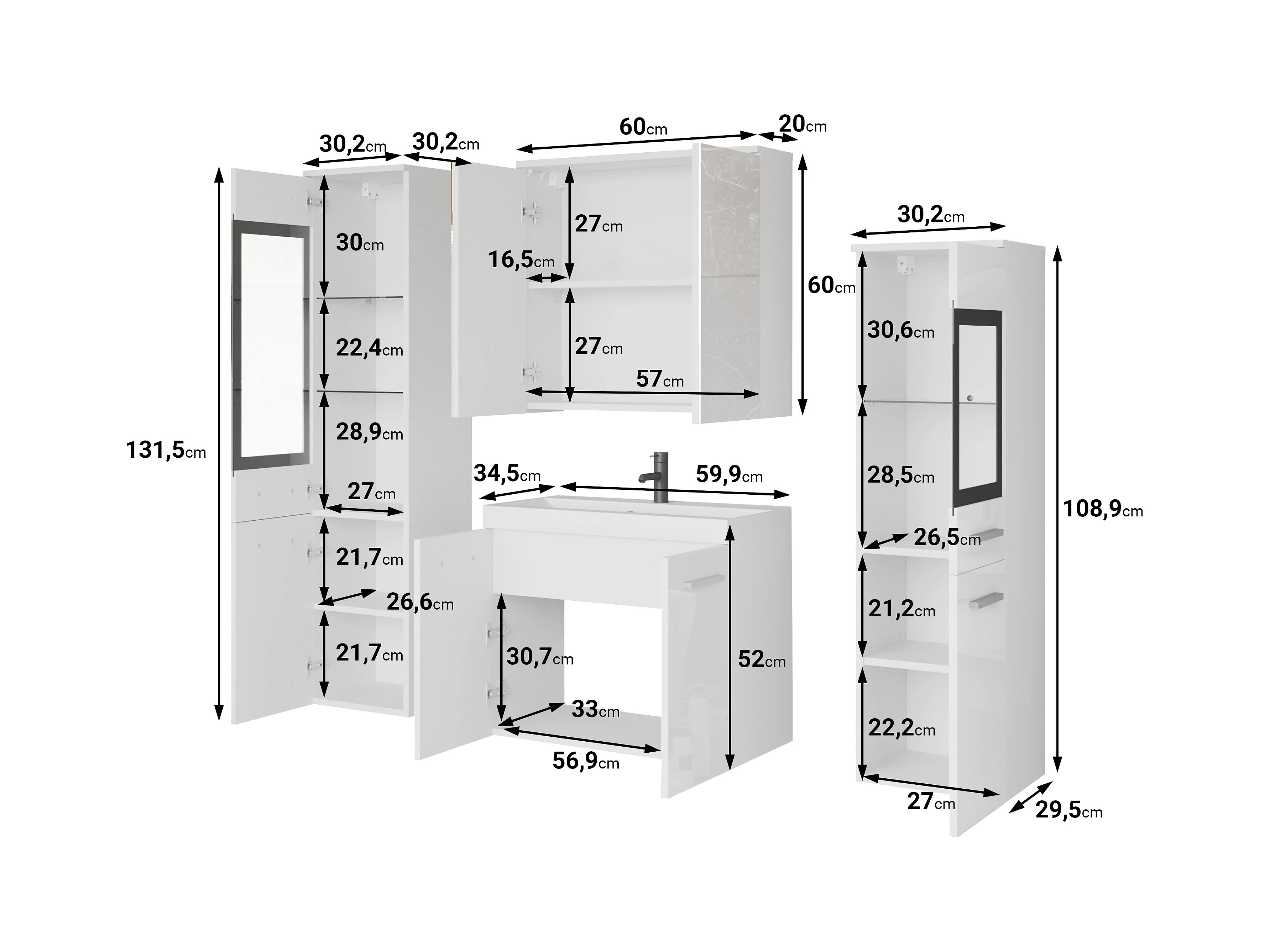Badkamermeubels met LED, hangende set met wastafel, 2 kolomkasten en spiegelkast, corpus wit mat, fronten wit hoogglans