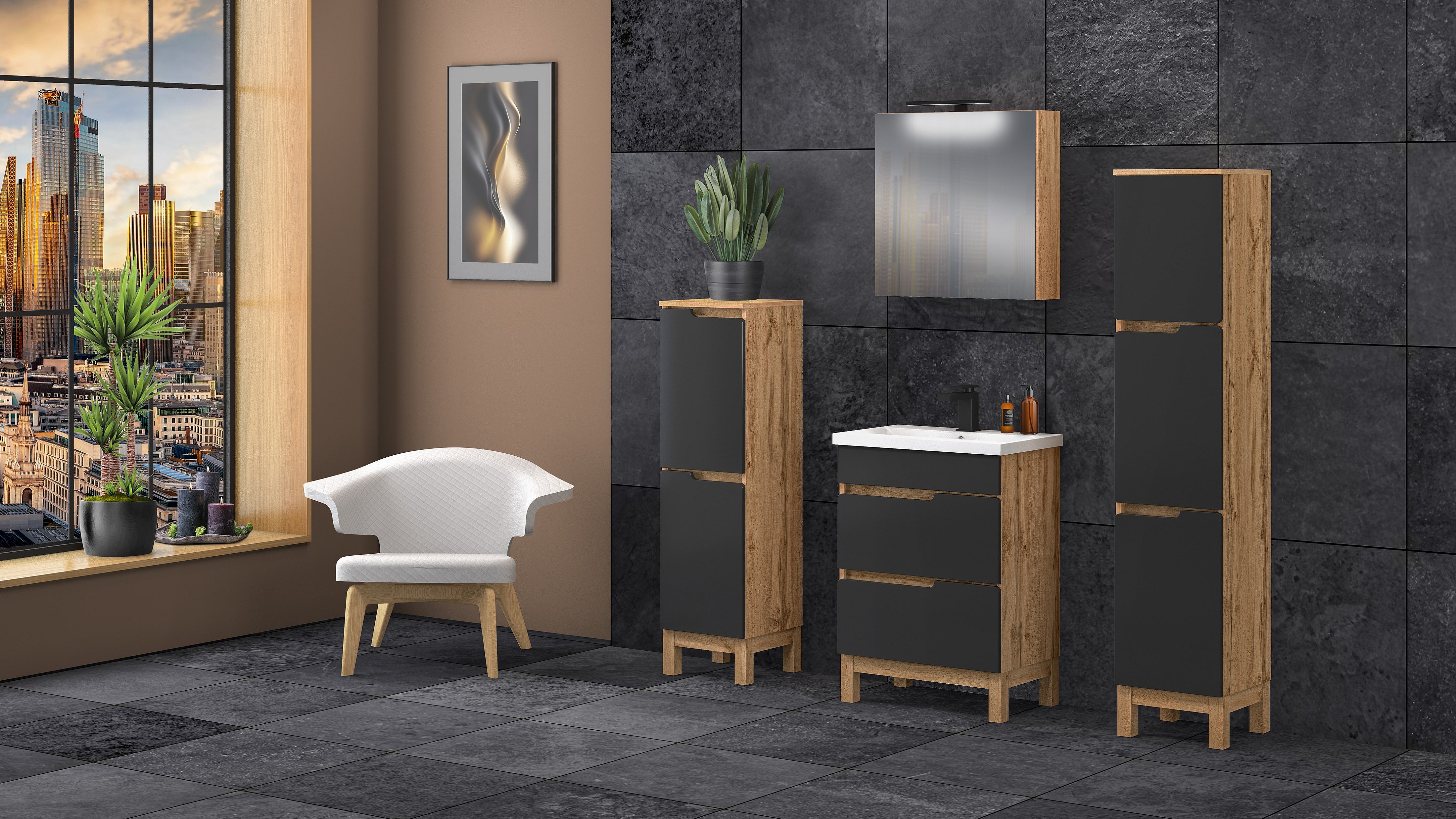 Badkamerset 60 cm Alma Kolom Kast met spiegel Eiken Wotan / Mat zwart