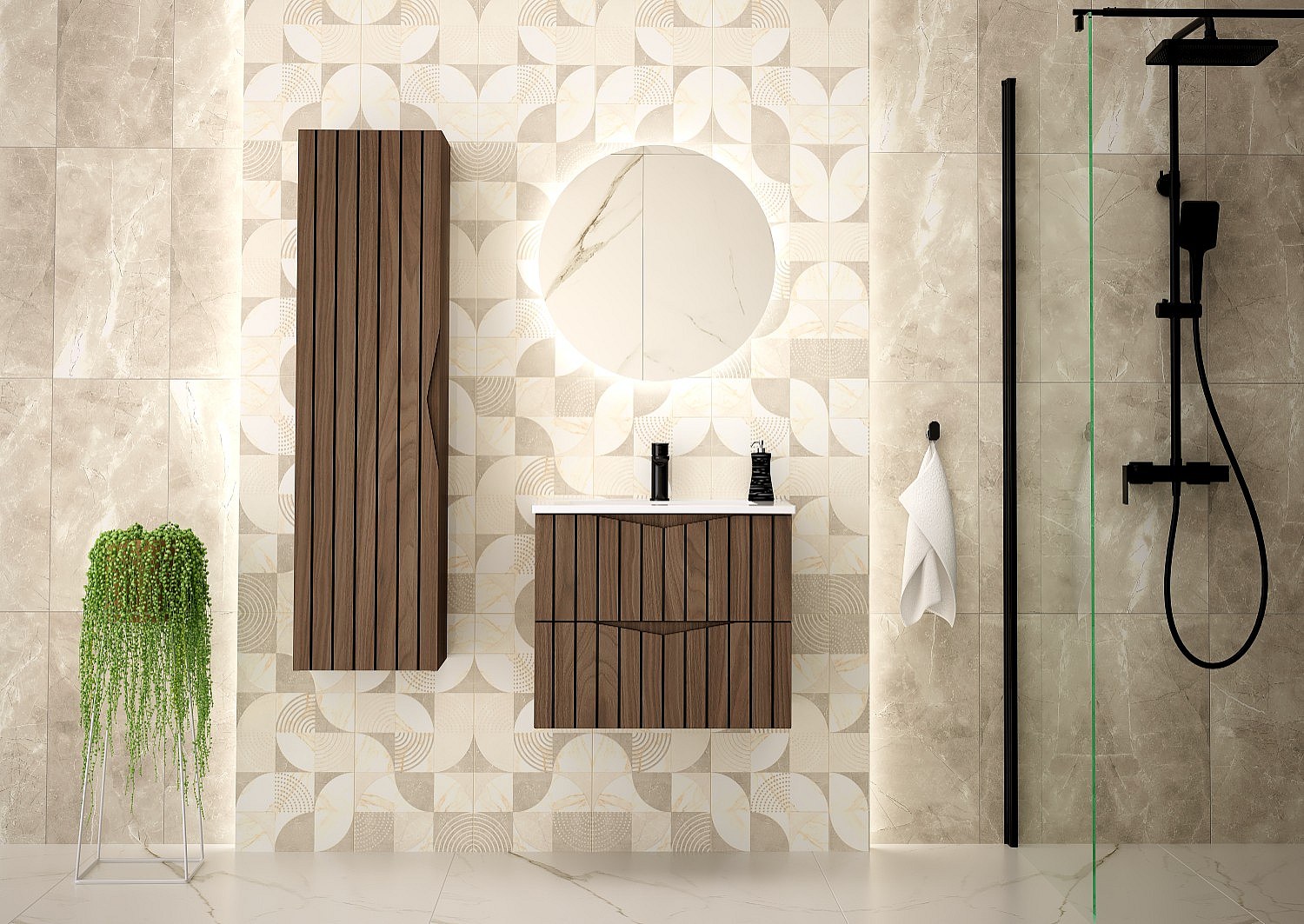 Badkamerset 60 cm Kast met wastafel Kolom Geribbelde fronten Eiken Noten Stella