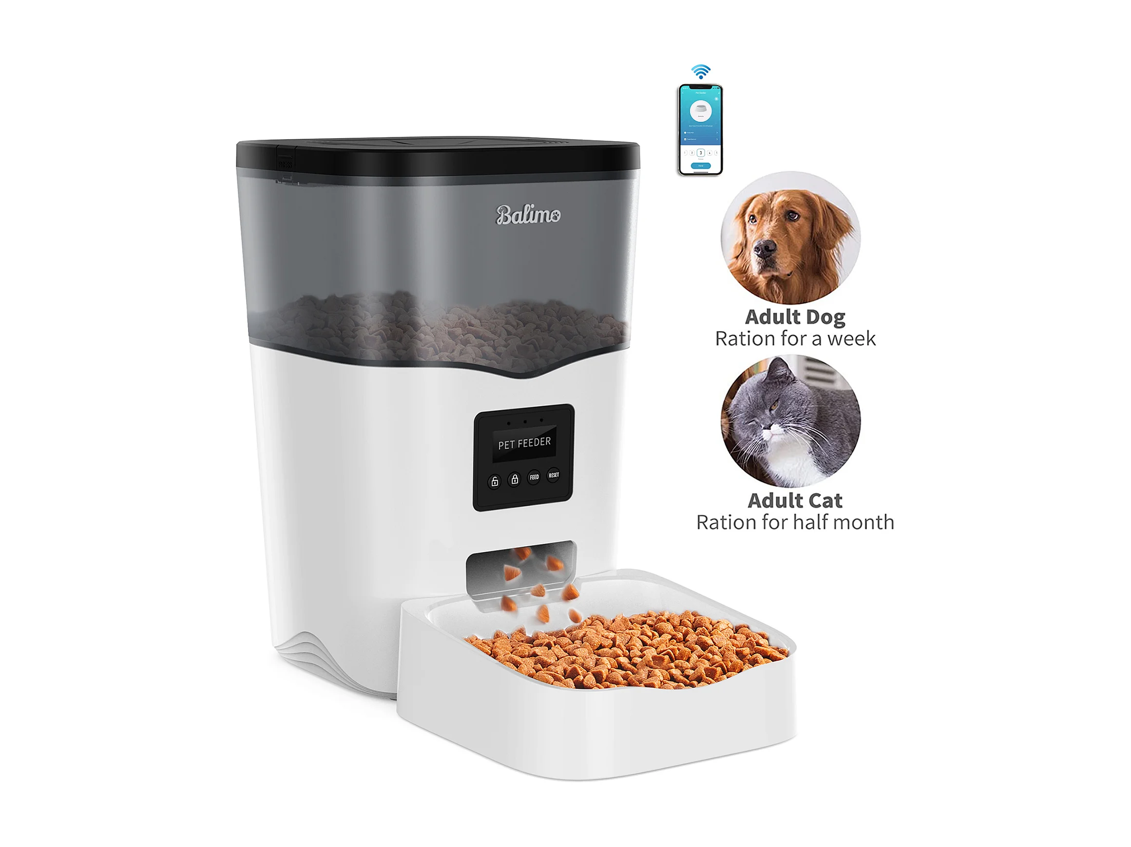 Balimo WIFI 3L Droogvoer Dispenser,Zwart,voor Katten/Honden Mobiele Telefoon Afstandsbediening,Stroomadapter/Batterij,Opname Functie