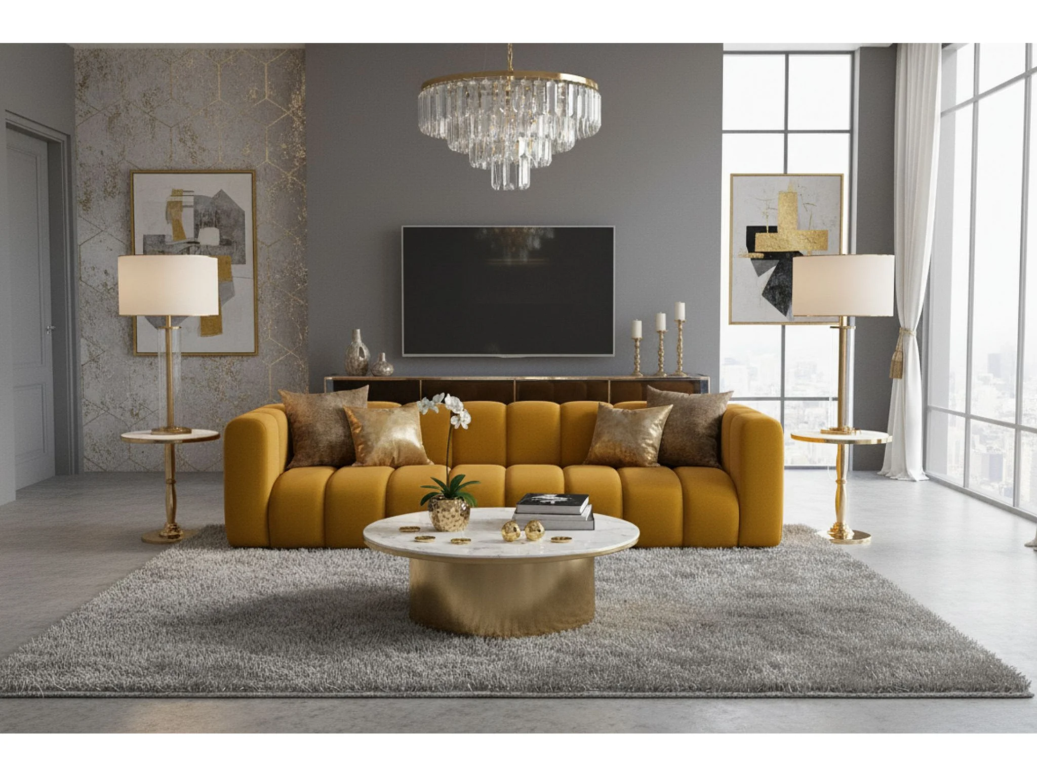 Bank, Vierzitsbank Grand, Veloursstof Salvador, Geel