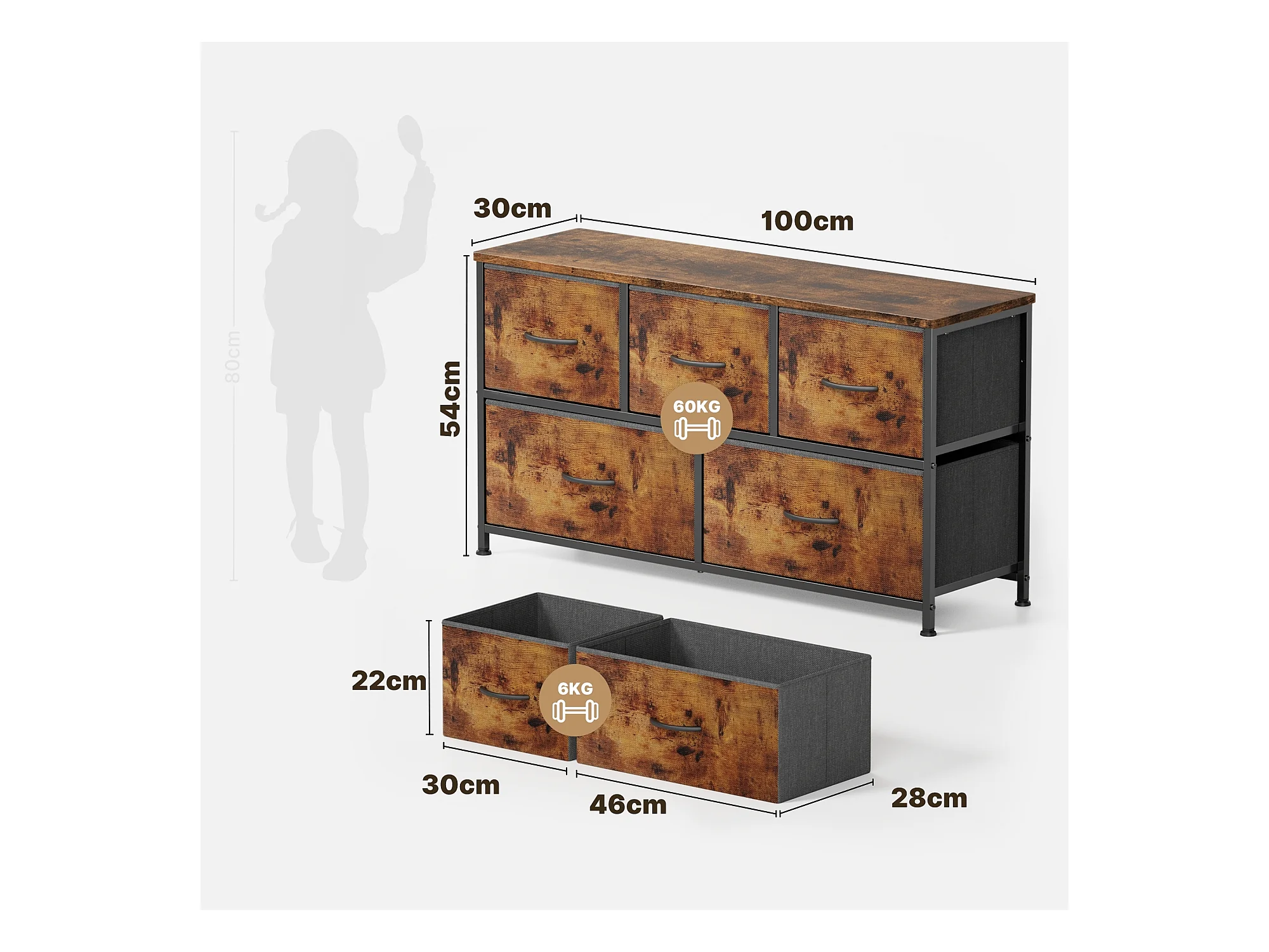 Bealife slaapkamerkommode met 5 linnen laden, staal frame, verstelbare plastic poten, bruine vintage inrichting