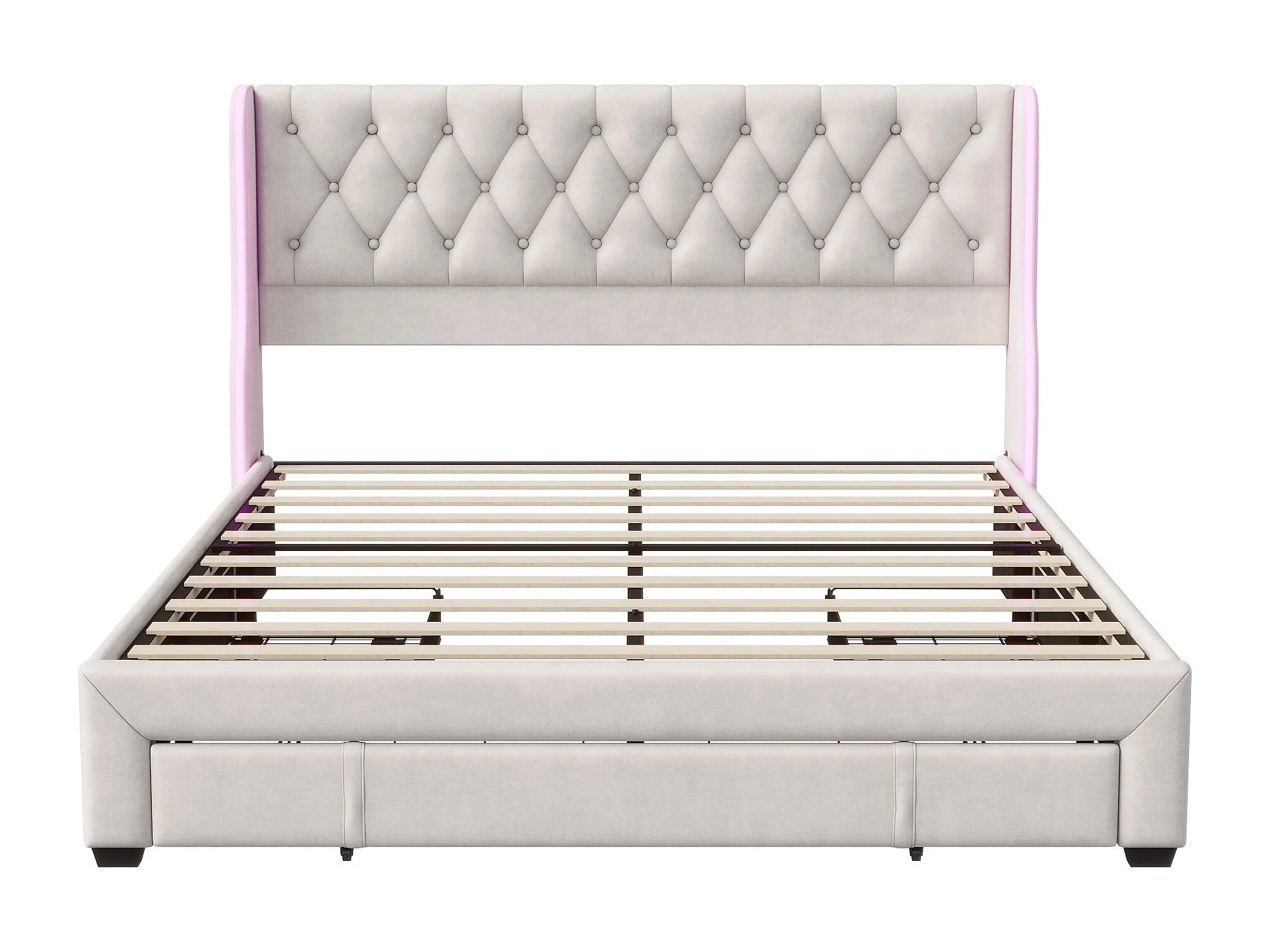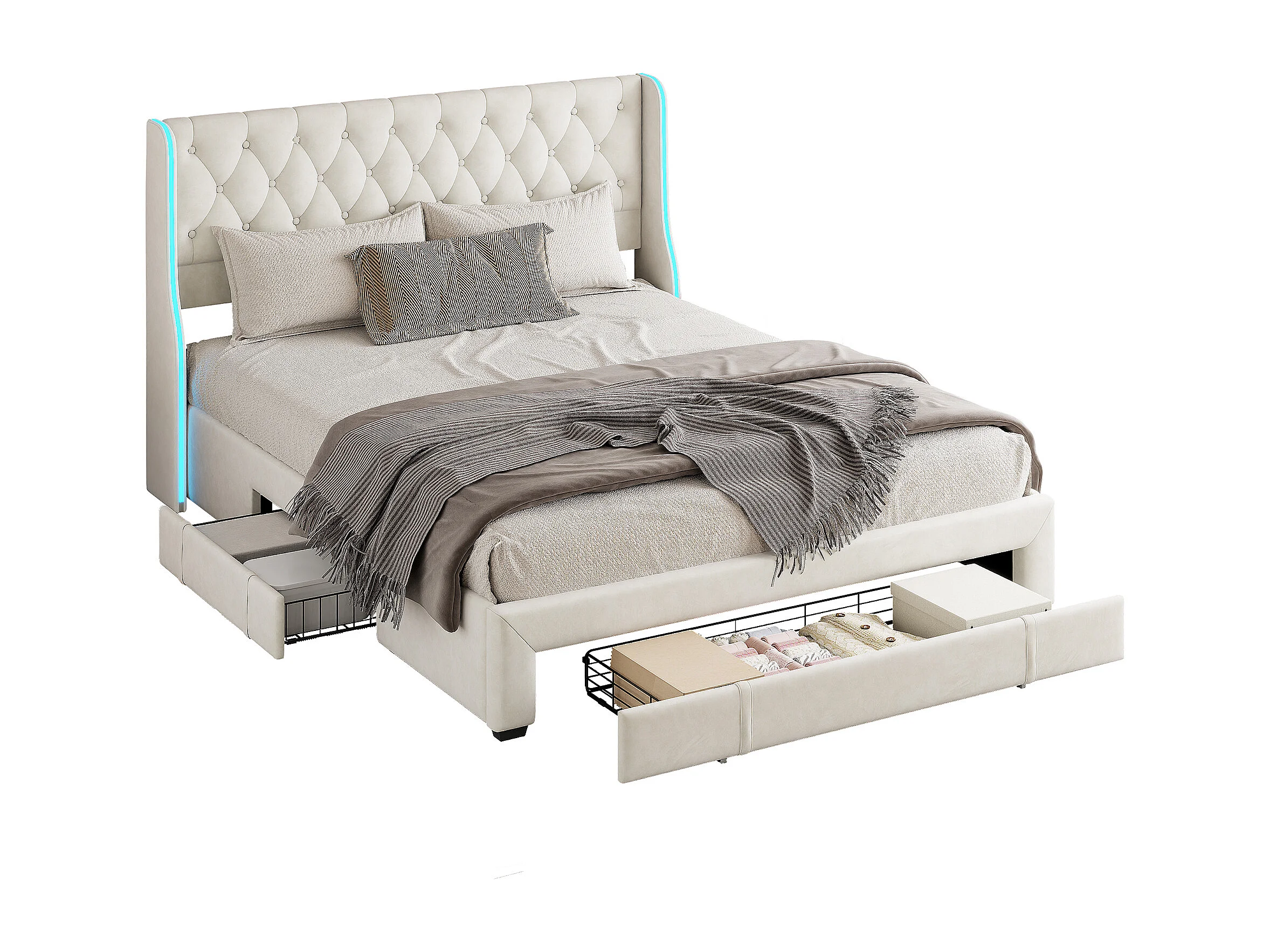 Gestoffeerd volwassen bed met LED en 2 USB-oplaadpoorten - 4 lades + lattenbodem - fluwelen stof - 140x200cm - Beige