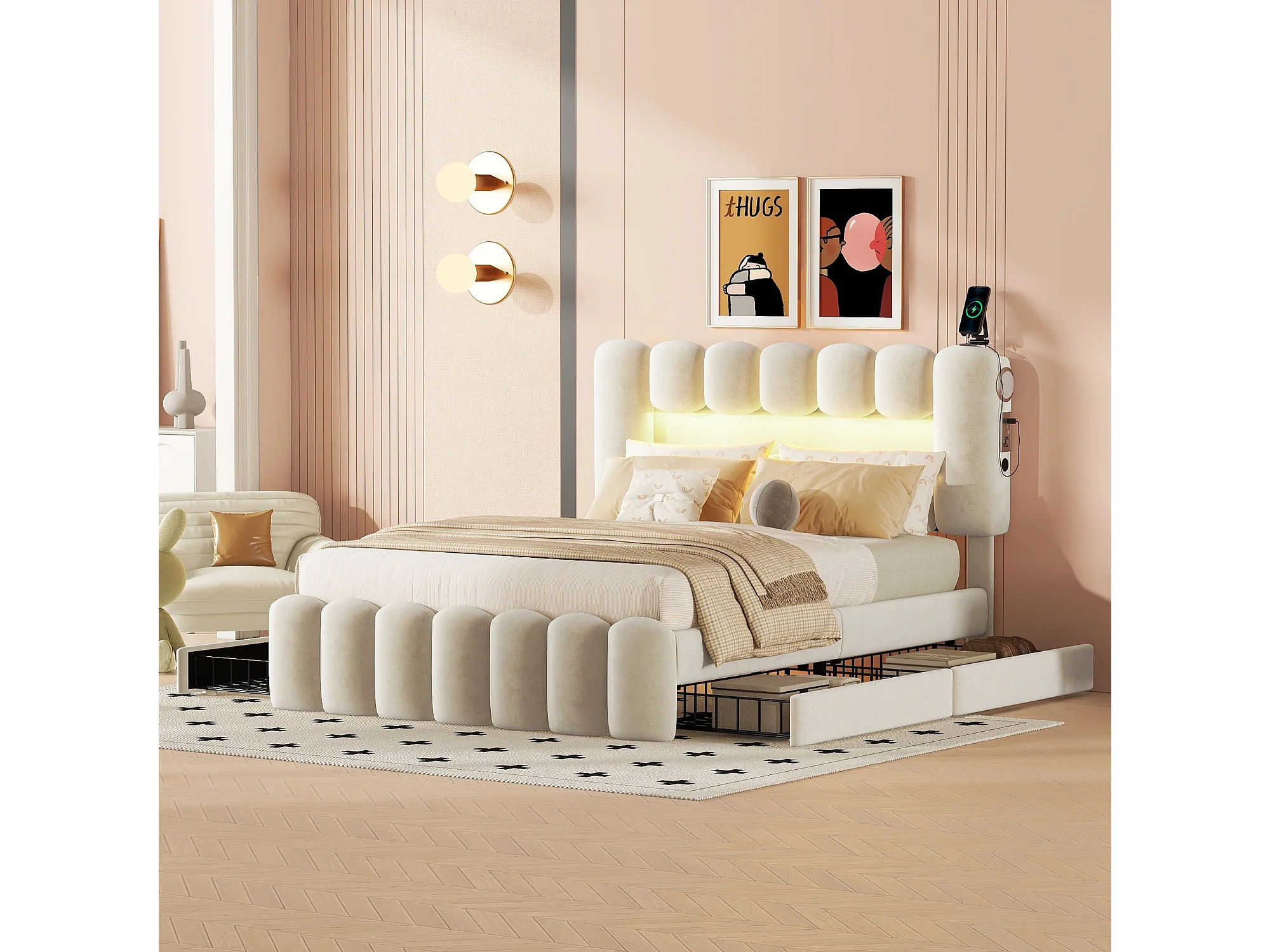 Bed van 140 x 200 cm met 4 lades - LED-verlichting en USB - Fluweel - Beige