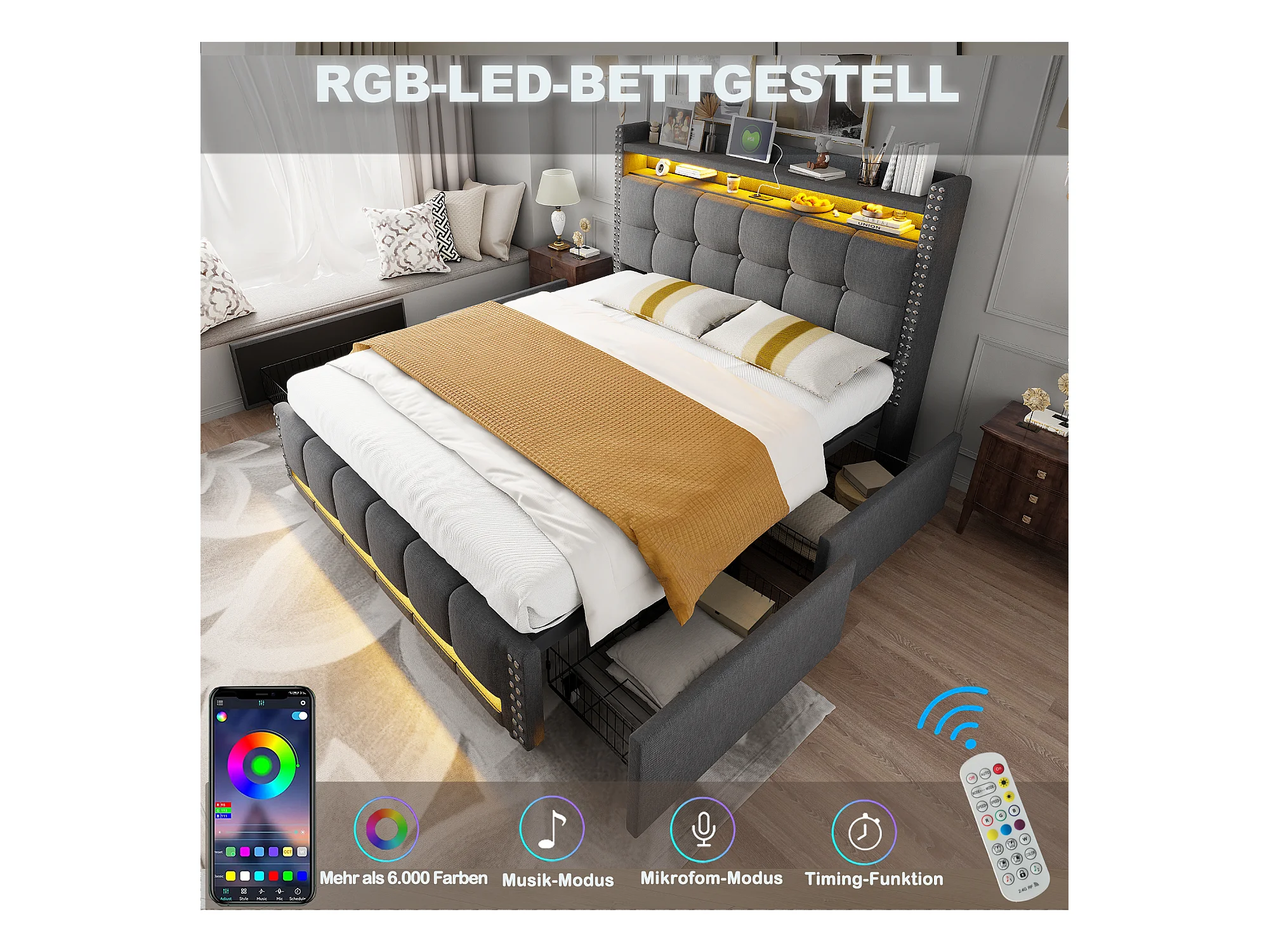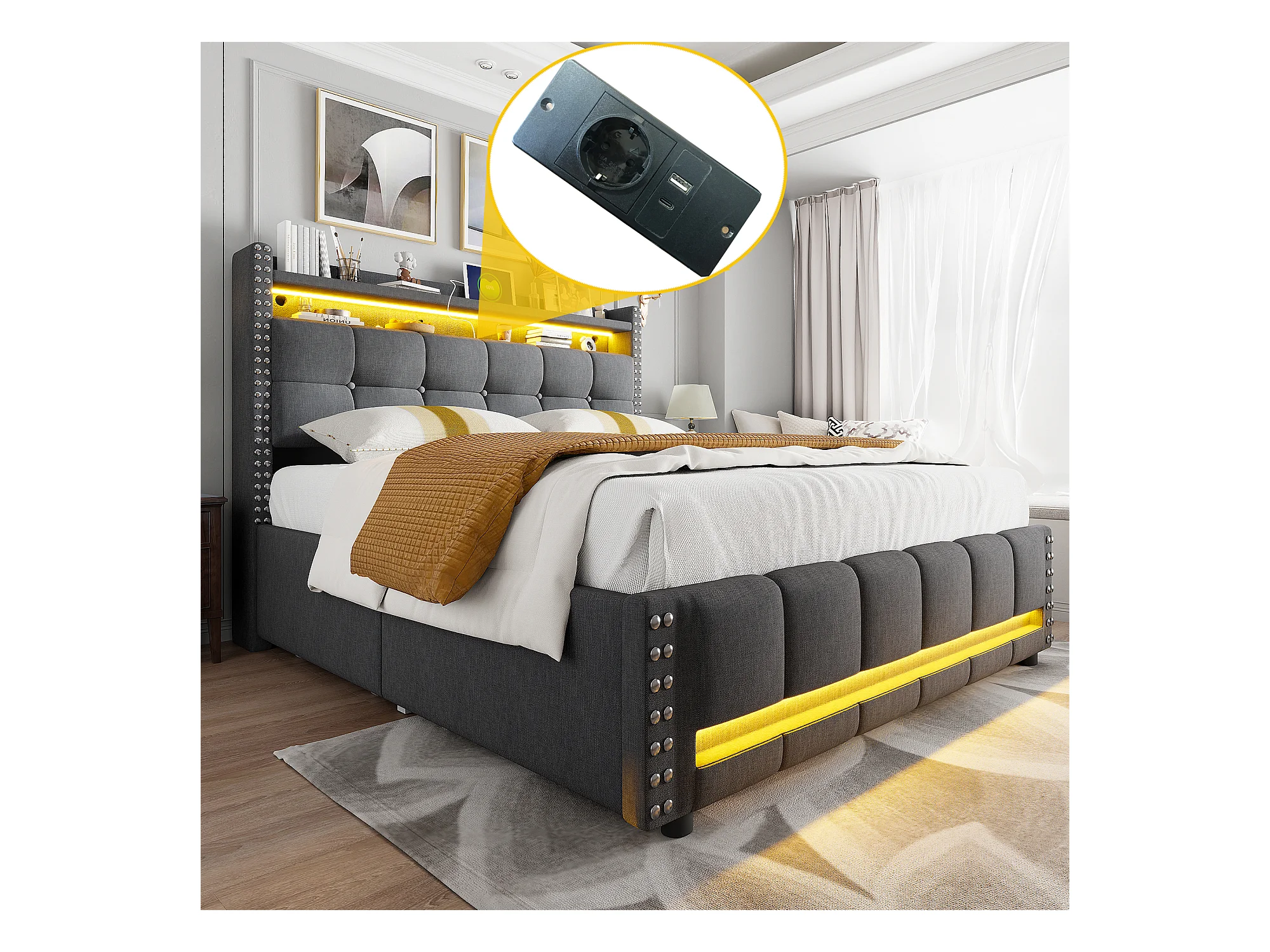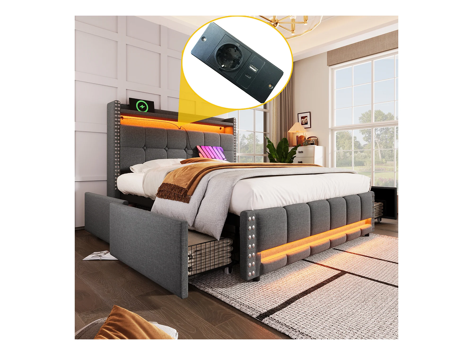 Bed 140 x 200 cm met LED en USB, hoofdbord met opbergruimte en 4 lades, grijze linnen stof (221 x 150 x 115 cm)