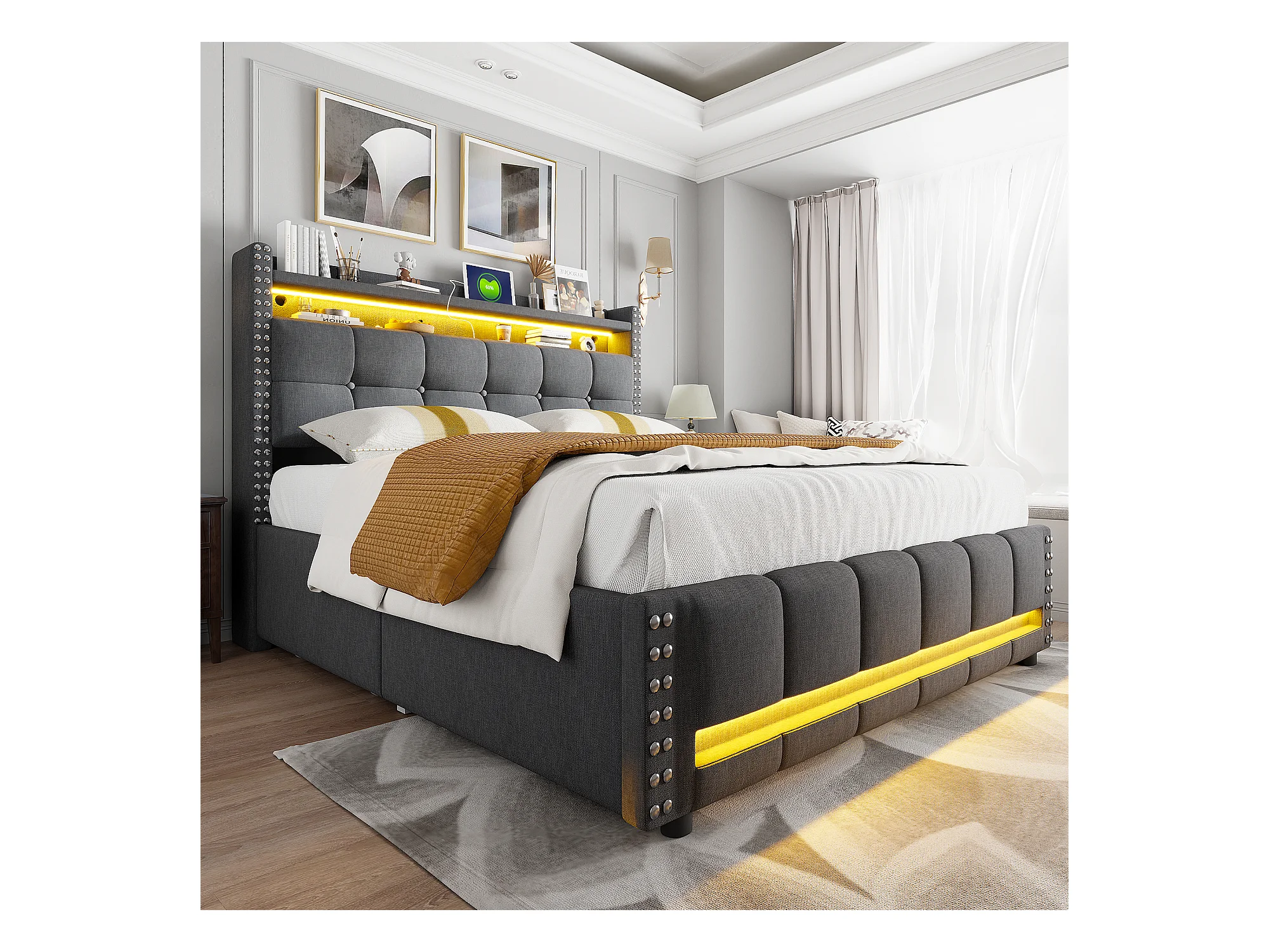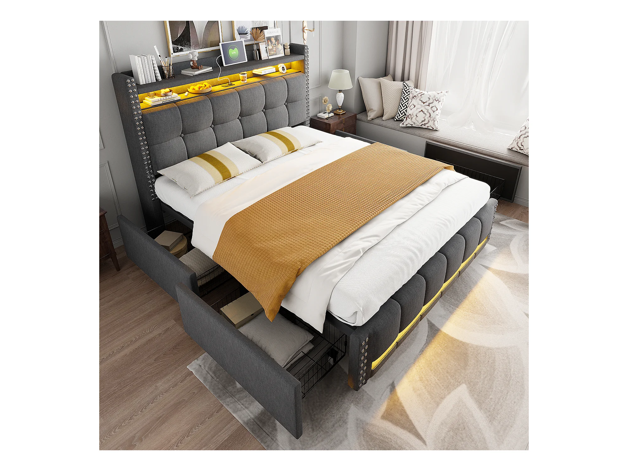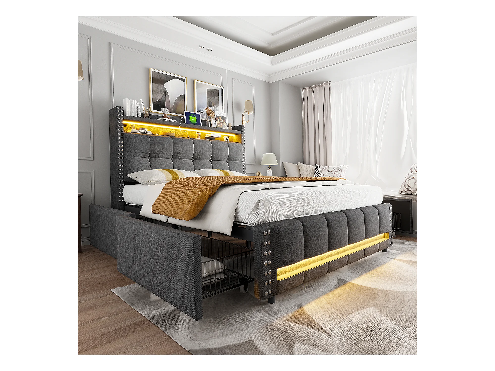 Tweepersoonsbed met ledverlichting, 4 lades, verstelbaar hoofdeinde, grijs linnen (149x207x102-112 cm)