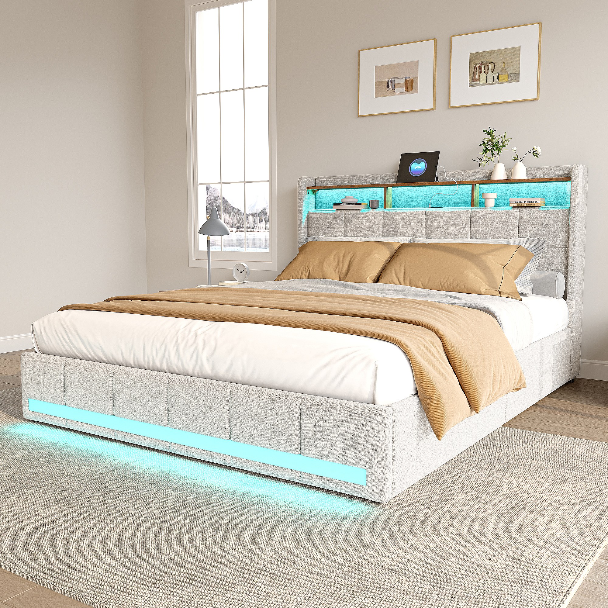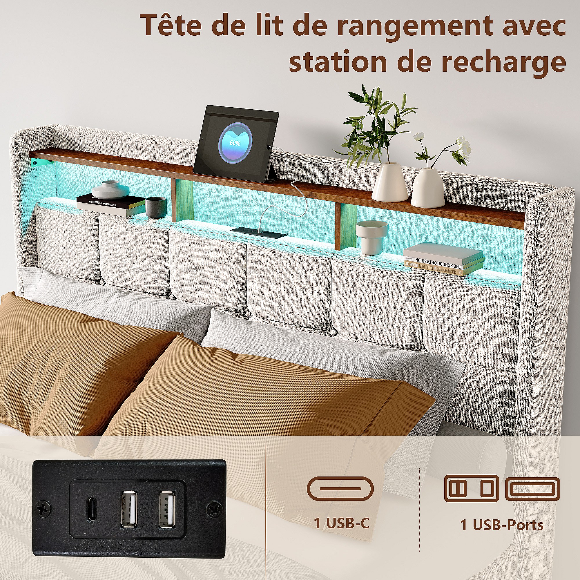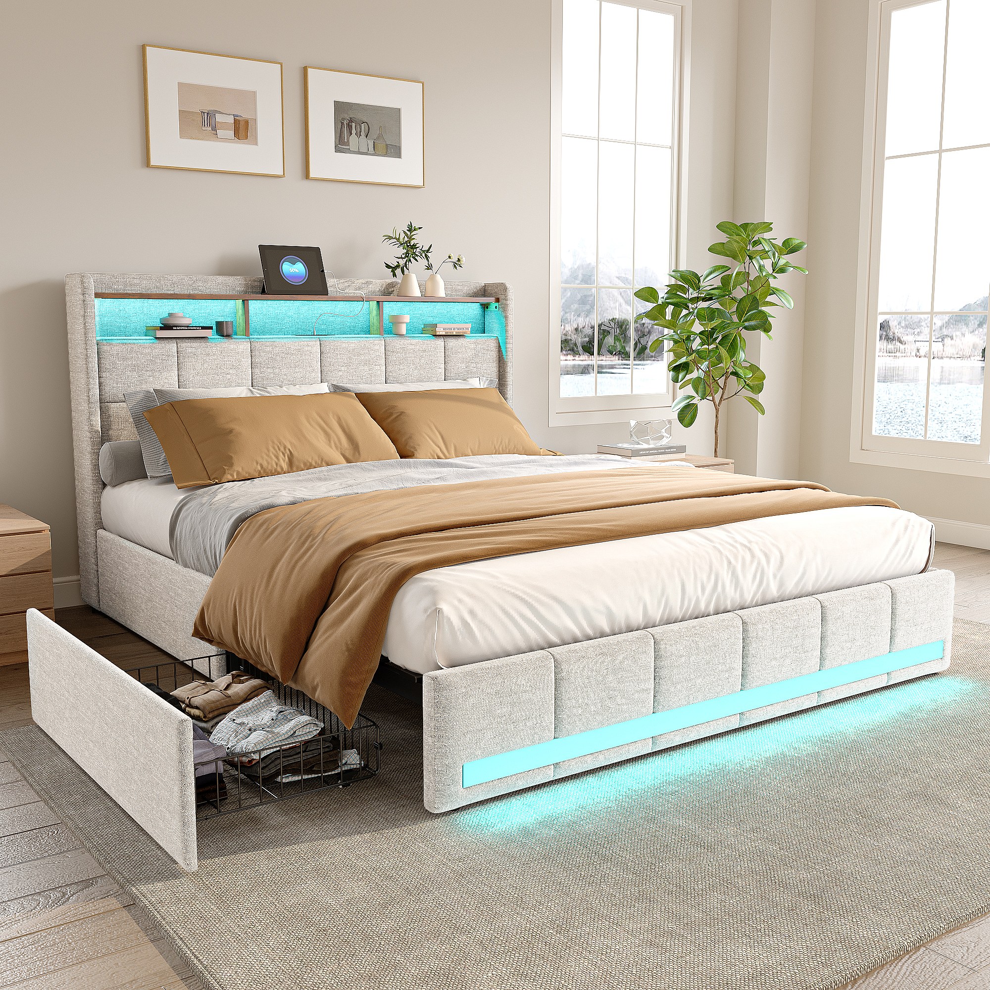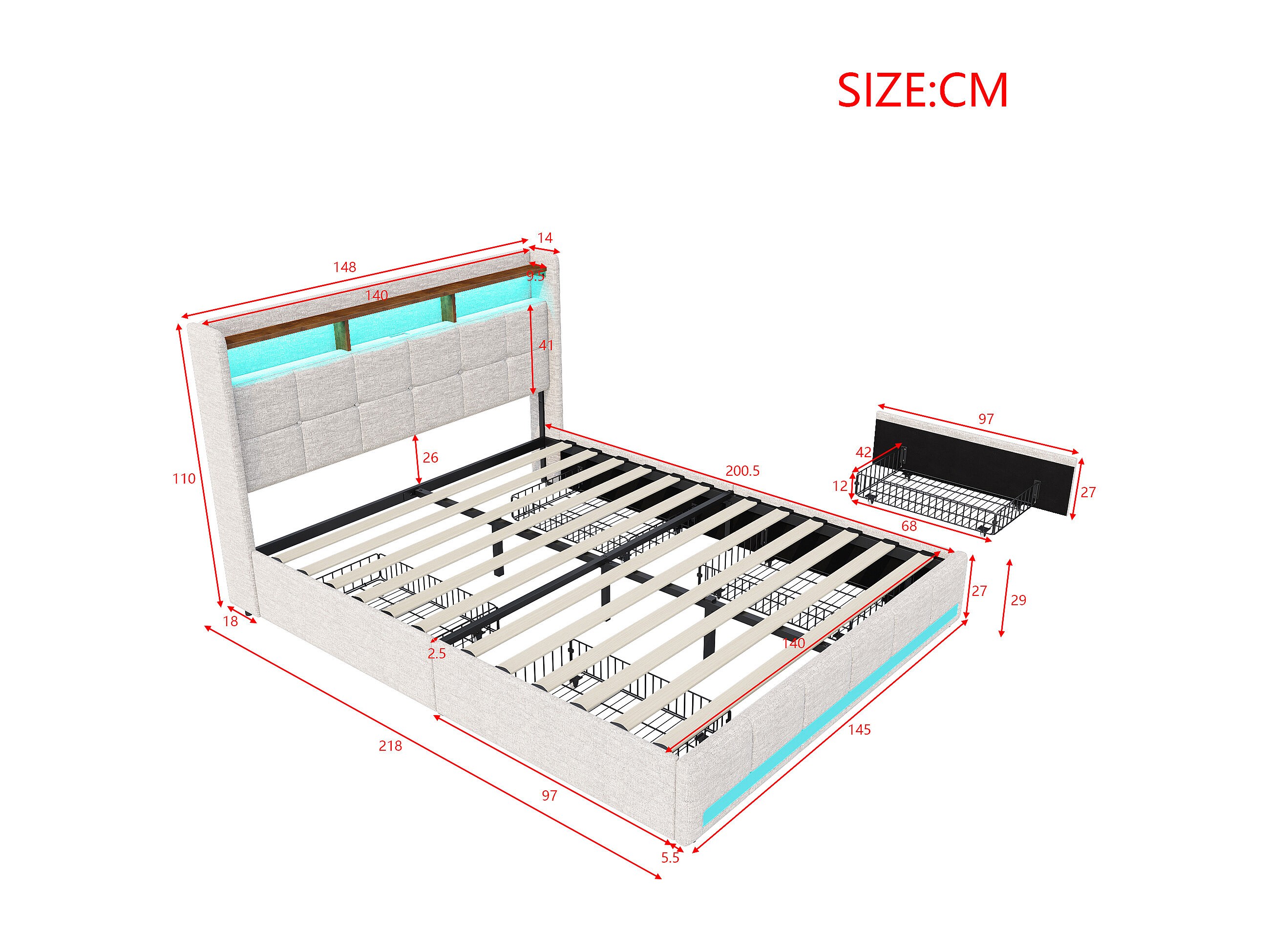 Bed 140x190 cm met LED-verlichting en USB, 4 lades en opberghoofdeinde, Linnen, Beige