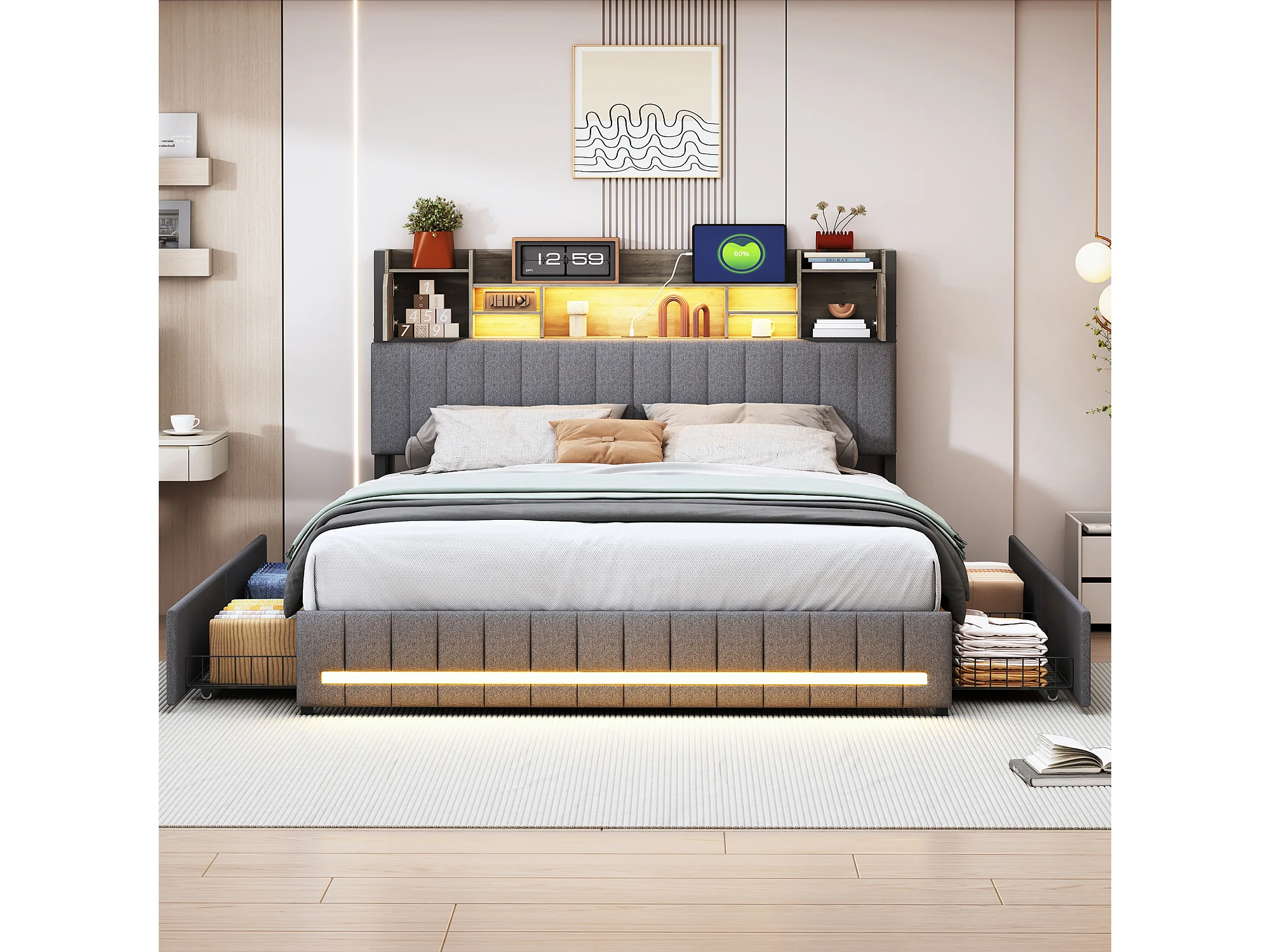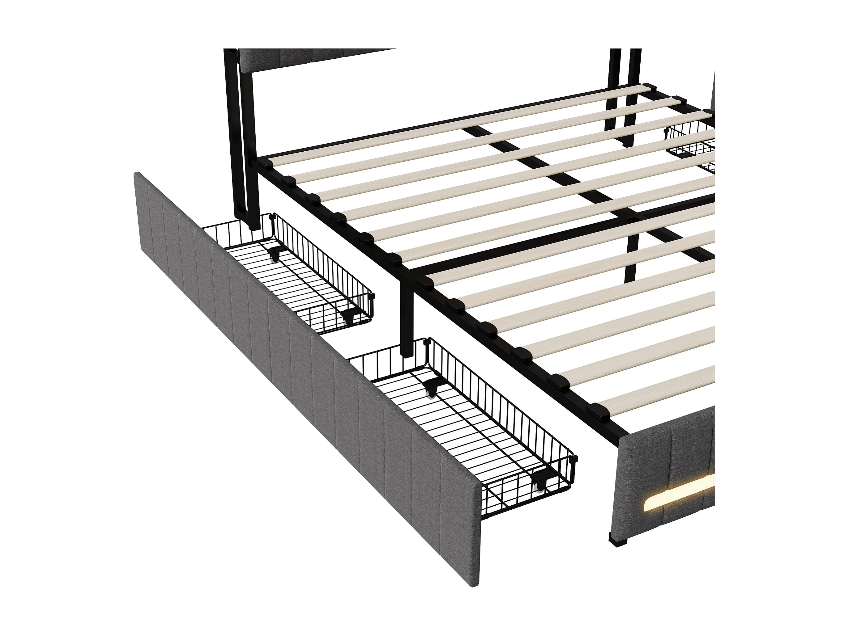 Bed 140x190 met LED en USB, gestoffeerd tweepersoonsbed met lattenbodem en 4 lades, linnen, grijs