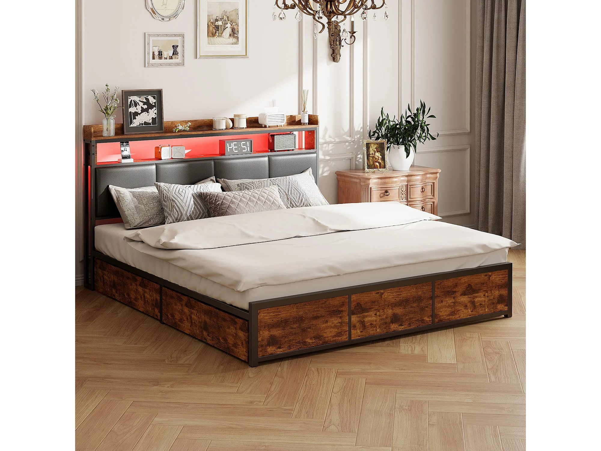 Bed van 140x200 cm met lattenbodem, ledverlichting en 4 lades, geschikt voor tieners. Matras niet inbegrepen.