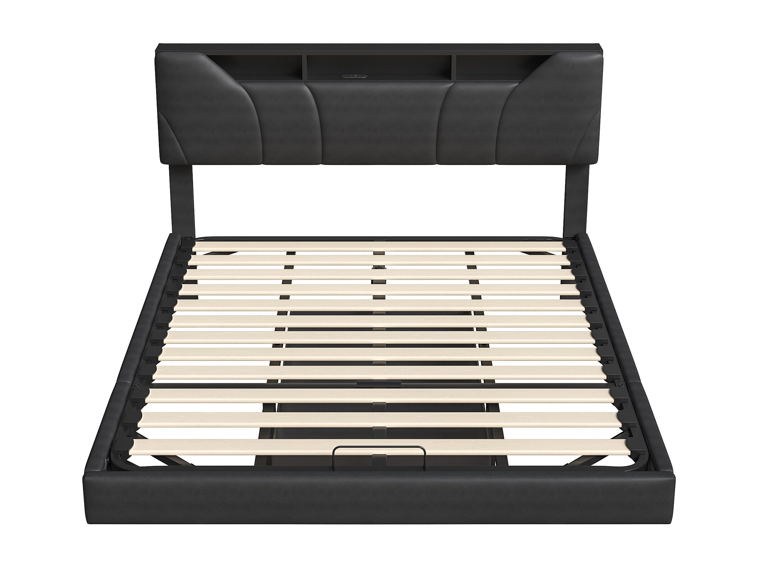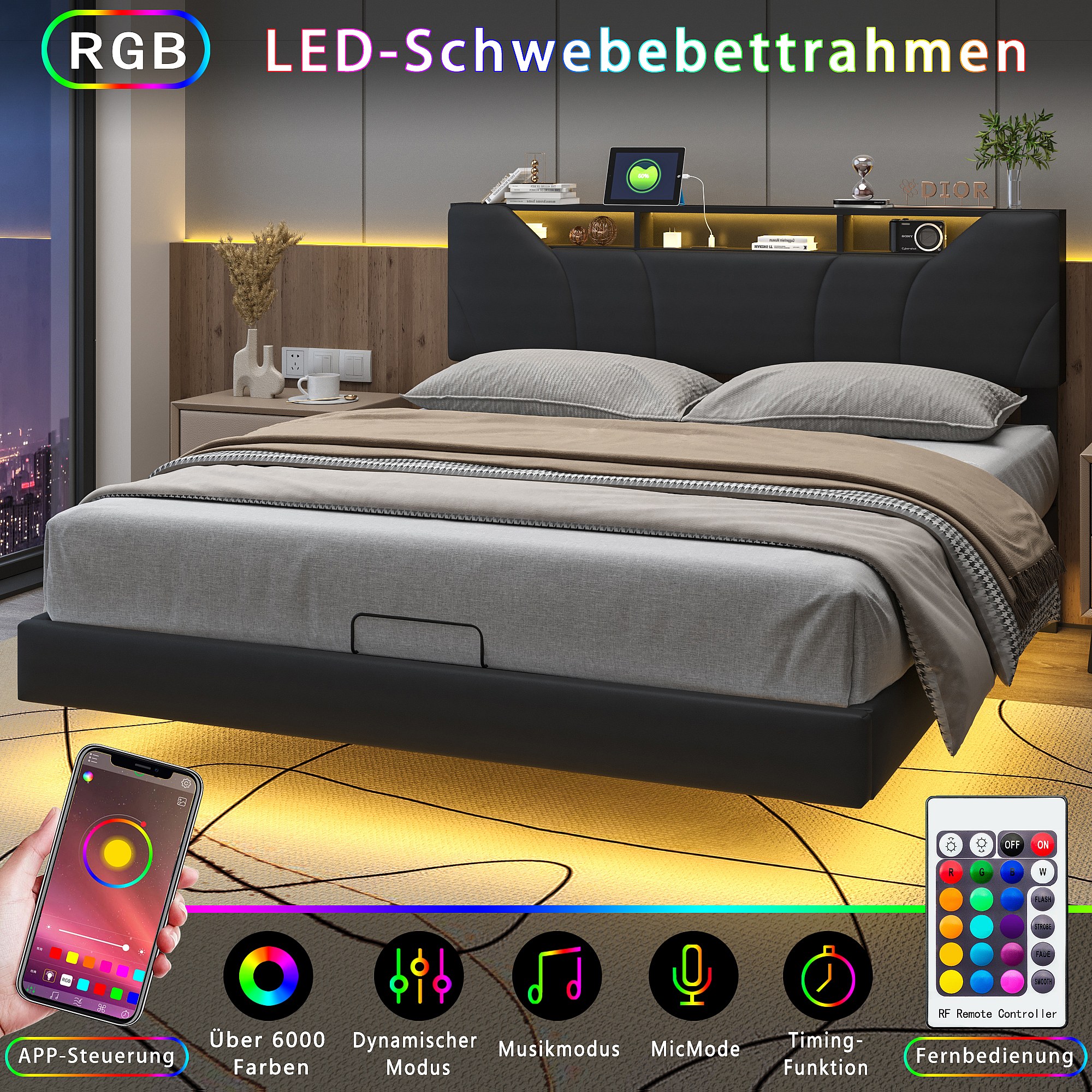 Bed 140x200 cm met LED-verlichting, Opbergbed met USB-aansluiting, Hoofdeinde in hoogte verstelbaar, Zwart