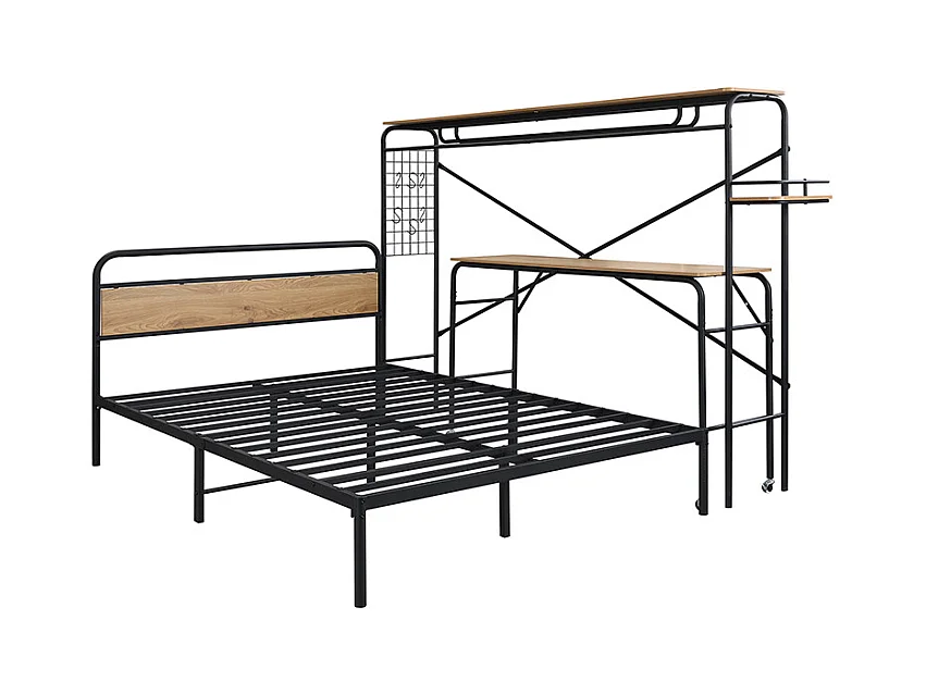 Bed 140x200 met lattenbodem, vlak bedframe met tafel en kapstok, tafel, zwart