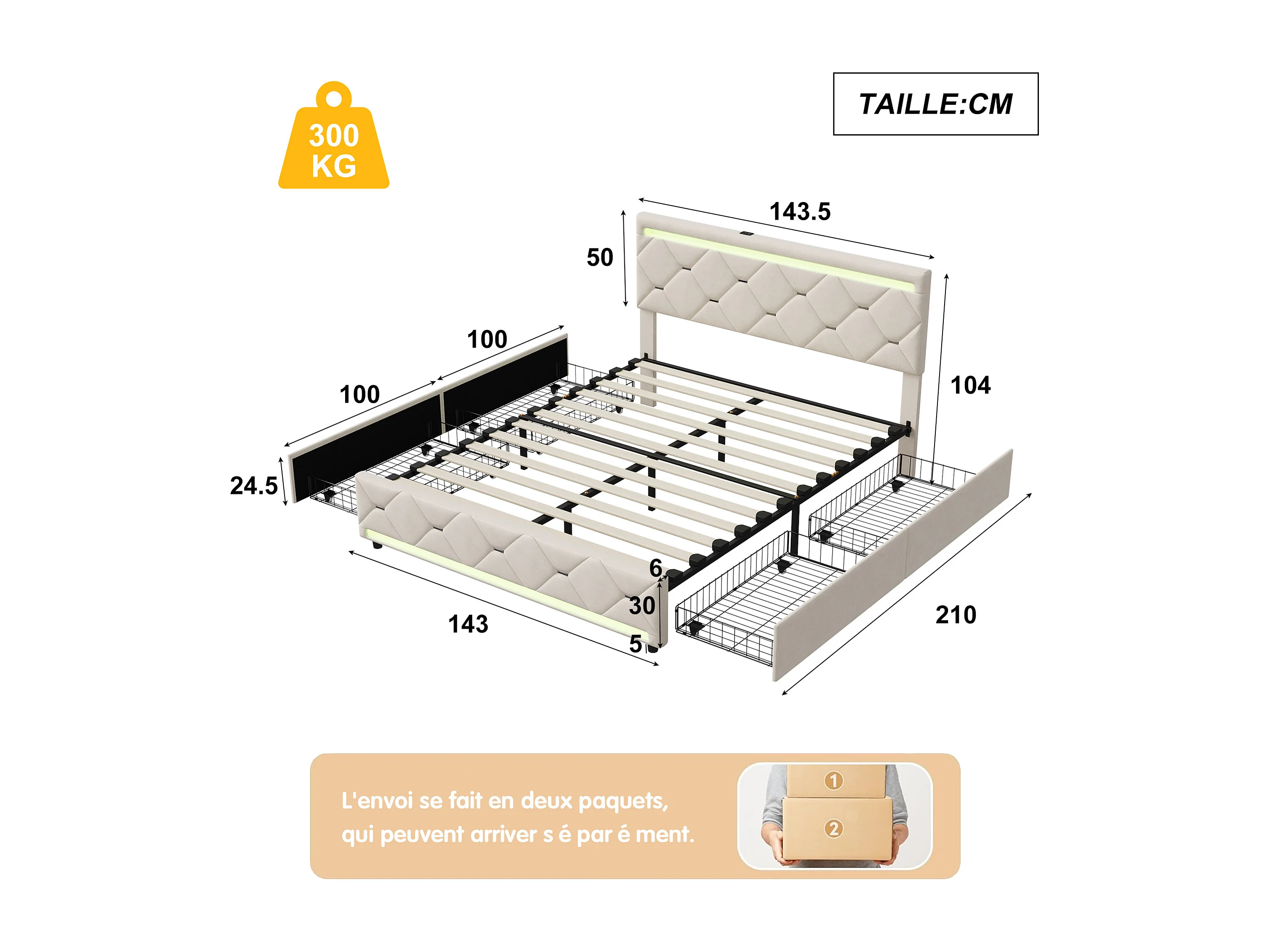 Bed 140x200 met LED-bodem en USB, gestoffeerd tweepersoonsbed met 4 opbergladen, gebroken wit