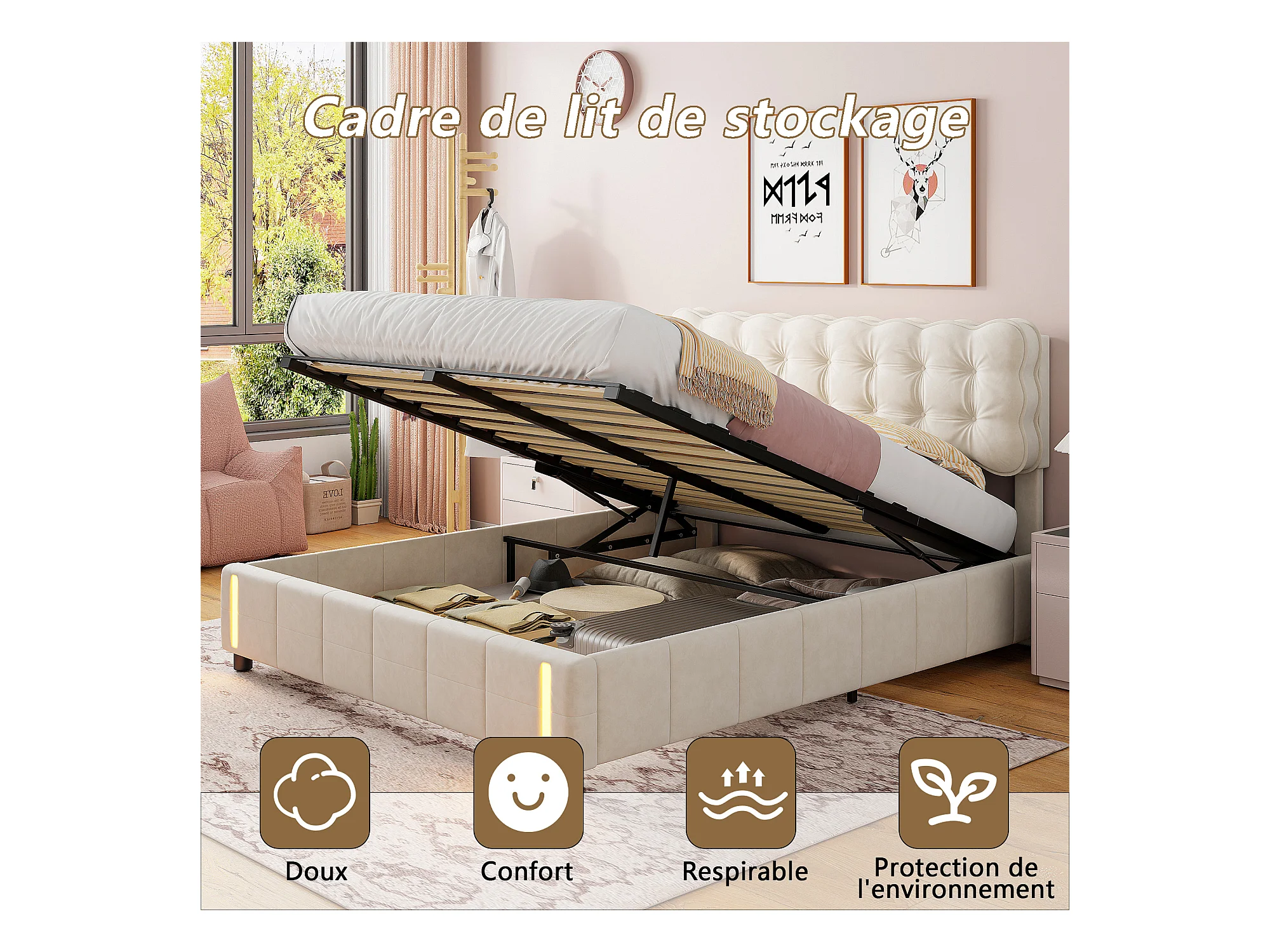 Bedframe met opbergruimte 140x200 cm met LED, tweepersoonsbed met lattenbodem, fluweel, beige