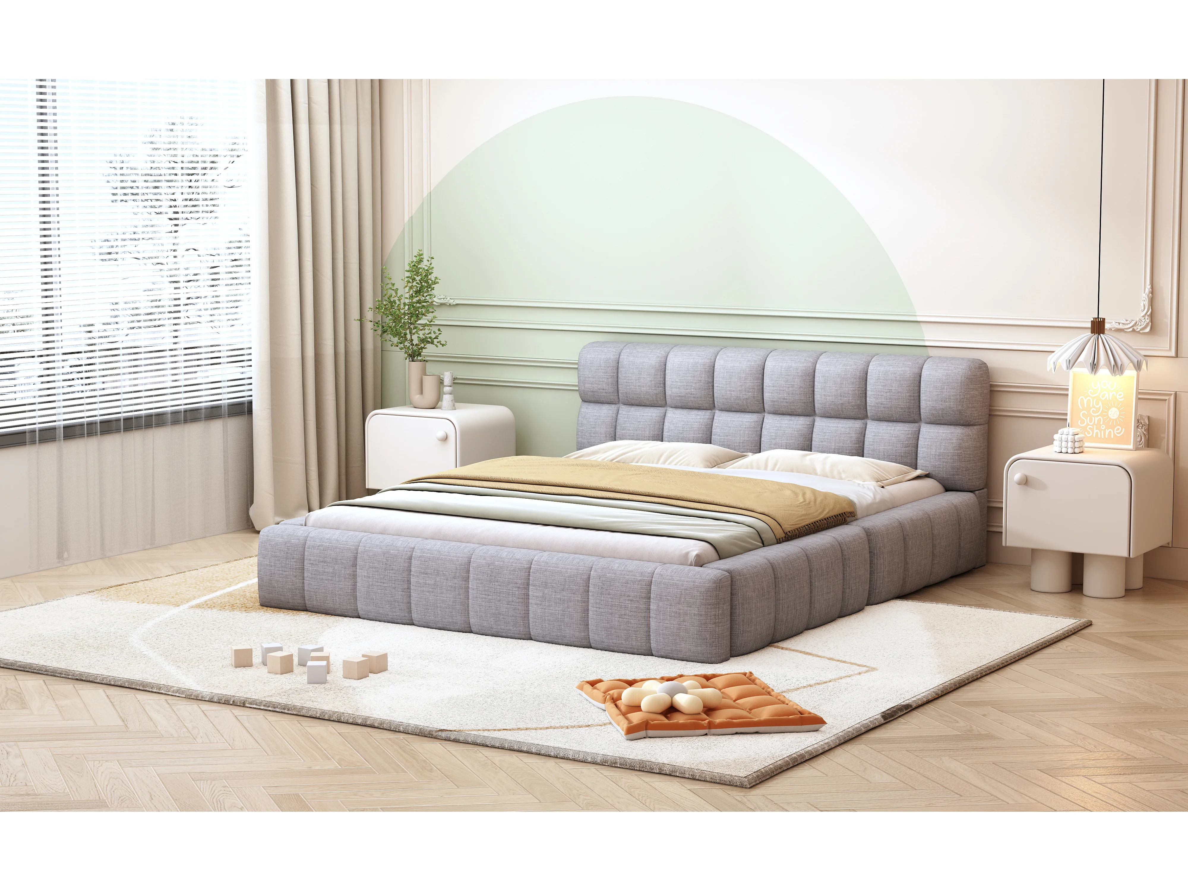 Bed 140x200cm, tweepersoonsbed met gestoffeerde rugleuning, gestoffeerd frame, lattenbodem, grijs linnen (216,5x155x66cm)