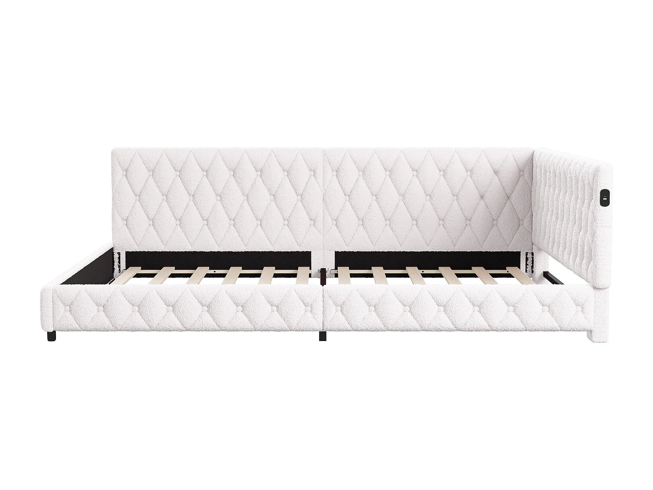 Bed 140x200cm, tweepersoonsbed met led-verlichting, USB-poort, type C, pluche stof, slaapbank, beige