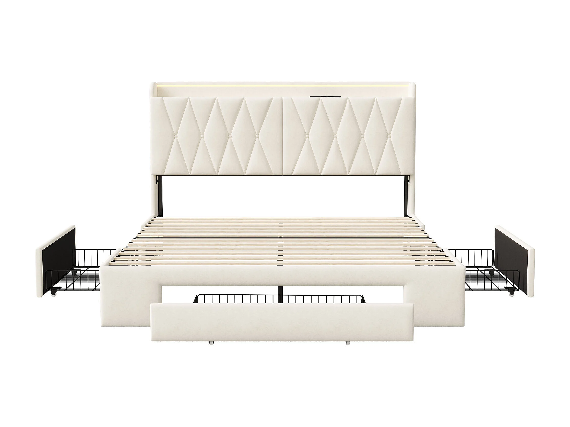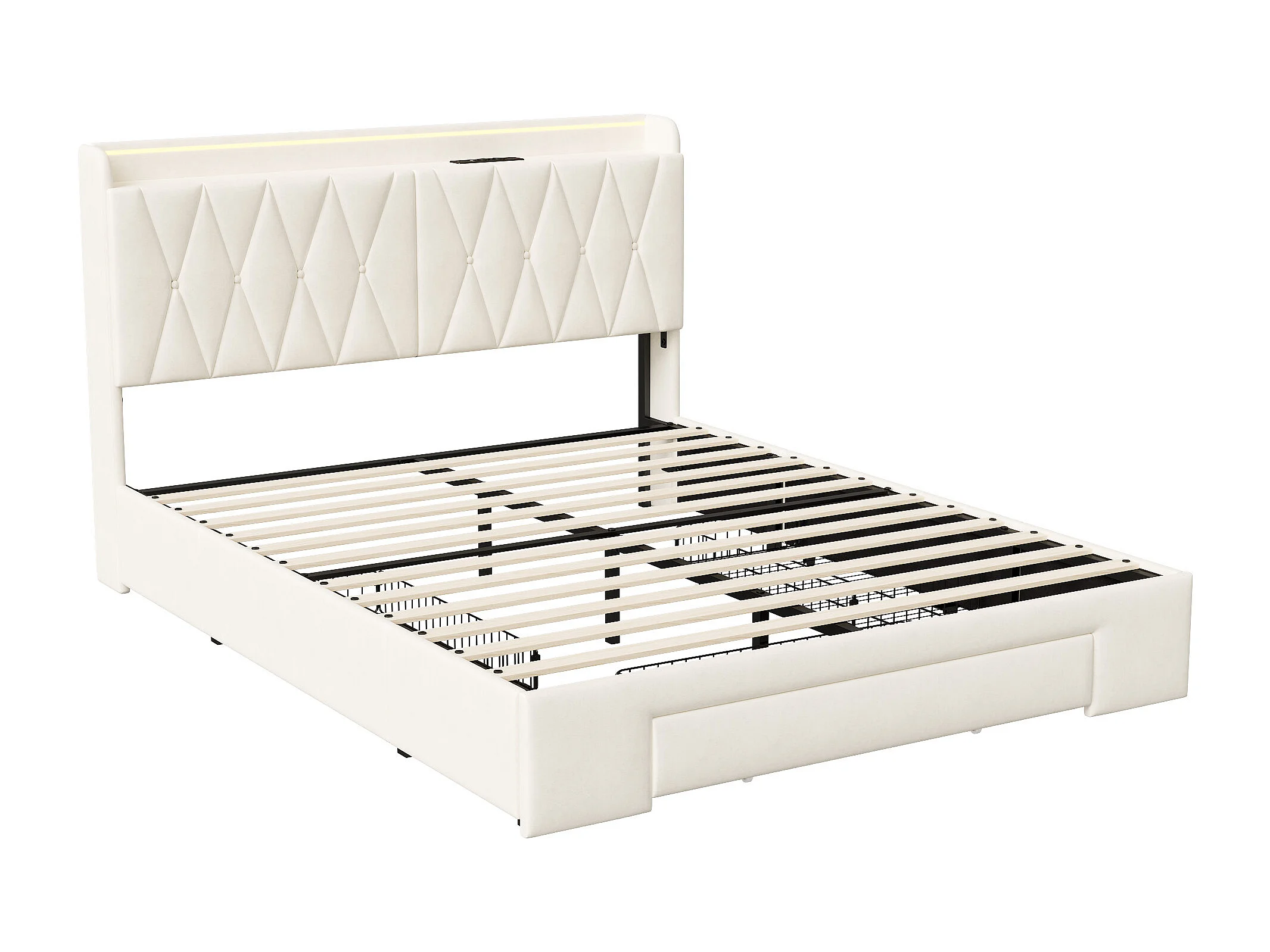 Bed 160 x 200 cm met onderstel en 3 lades, gewatteerd hoofdbord met opbergruimte en LED, USB, Beige