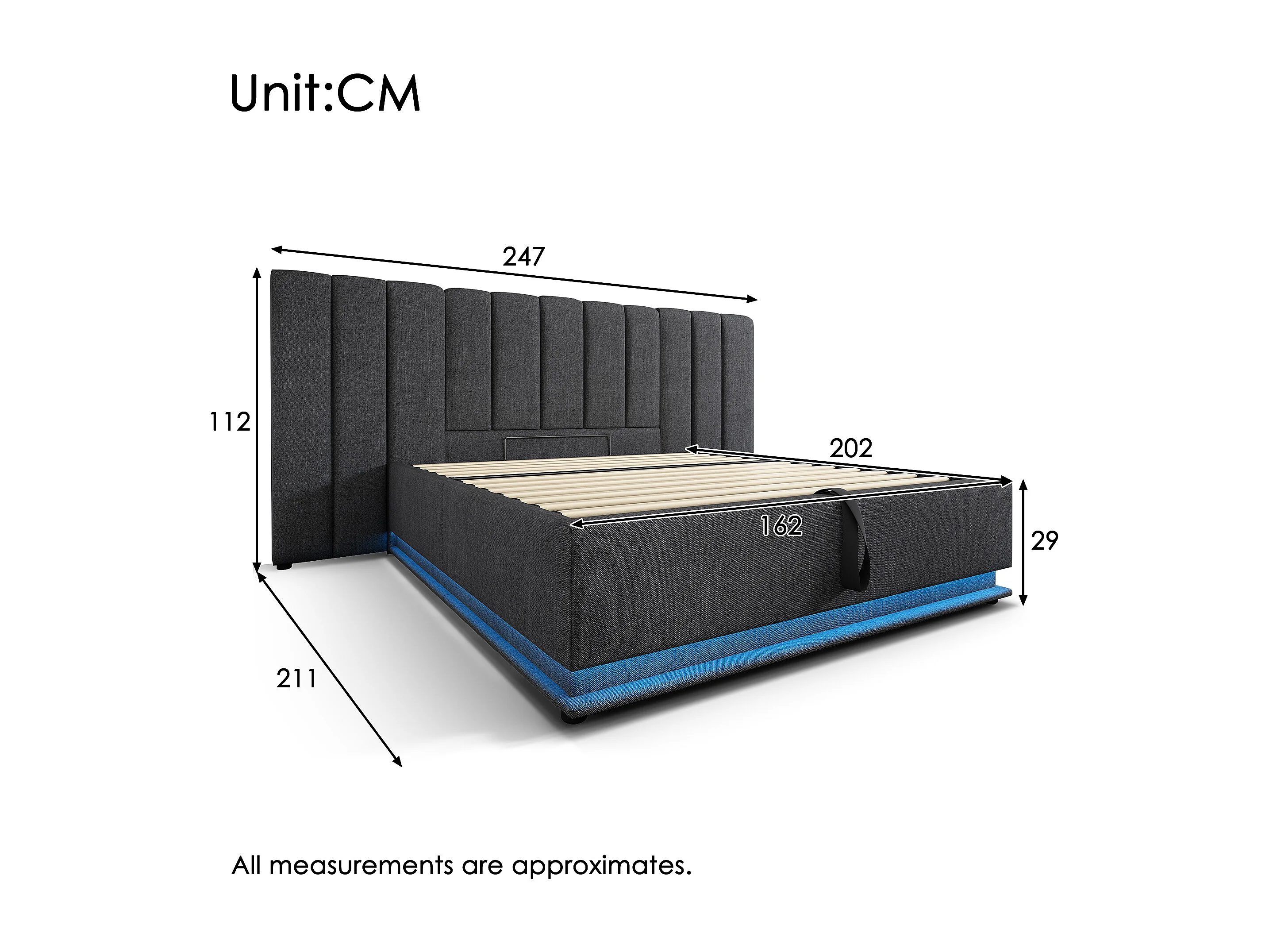 Bed 160×200, Bed met opbergruimte, LED-bediening via app en USB-C-lader, PU, Grijs (247x211x112 cm)