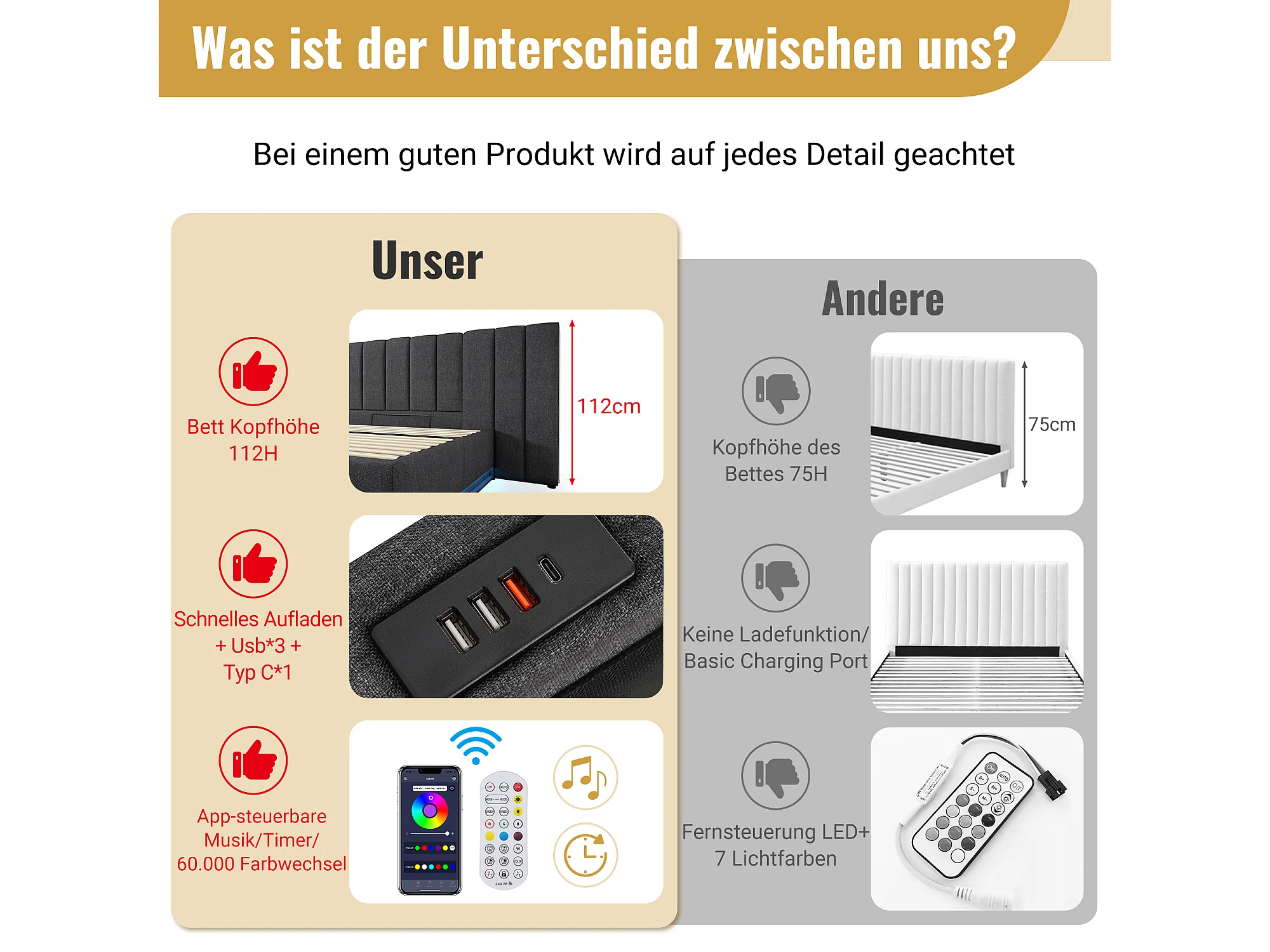 Tweepersoonsbed van metaal met RGBW LED, app-bediening, USB en stopcontacten, grijs linnen (166x222x99cm)