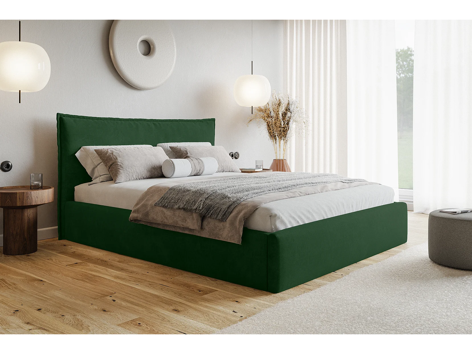 Bed 160x200 Zenito Slim met opbergruimte - hoofdbord in kussenvorm, metalen lattenbodem - Groen (Amor Velvet 4311)