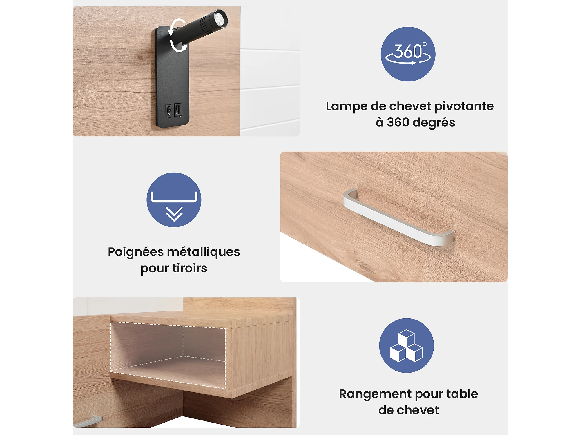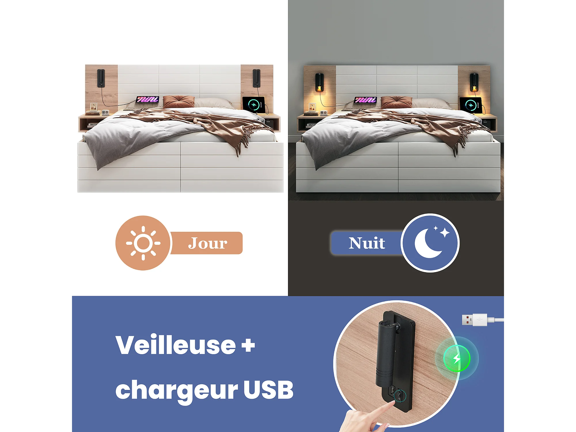 Bed 160x200cm - Hoofdeinde Met Leeslamp - USB Oplaadpunt - 2 Lades - Voor Slaapkamer - Hout & MDF - Wit+Lichtbruin - Zonder matras