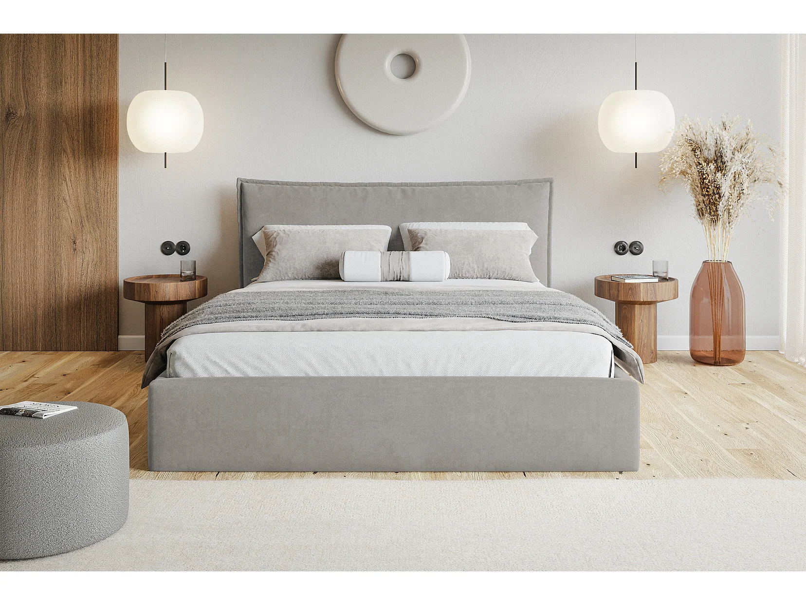 Bed 200x200 Zenito Slim met opbergruimte - hoofdbord in kussenvorm, metalen lattenbodem - Lichtgrijs (Amor Velvet 4318)