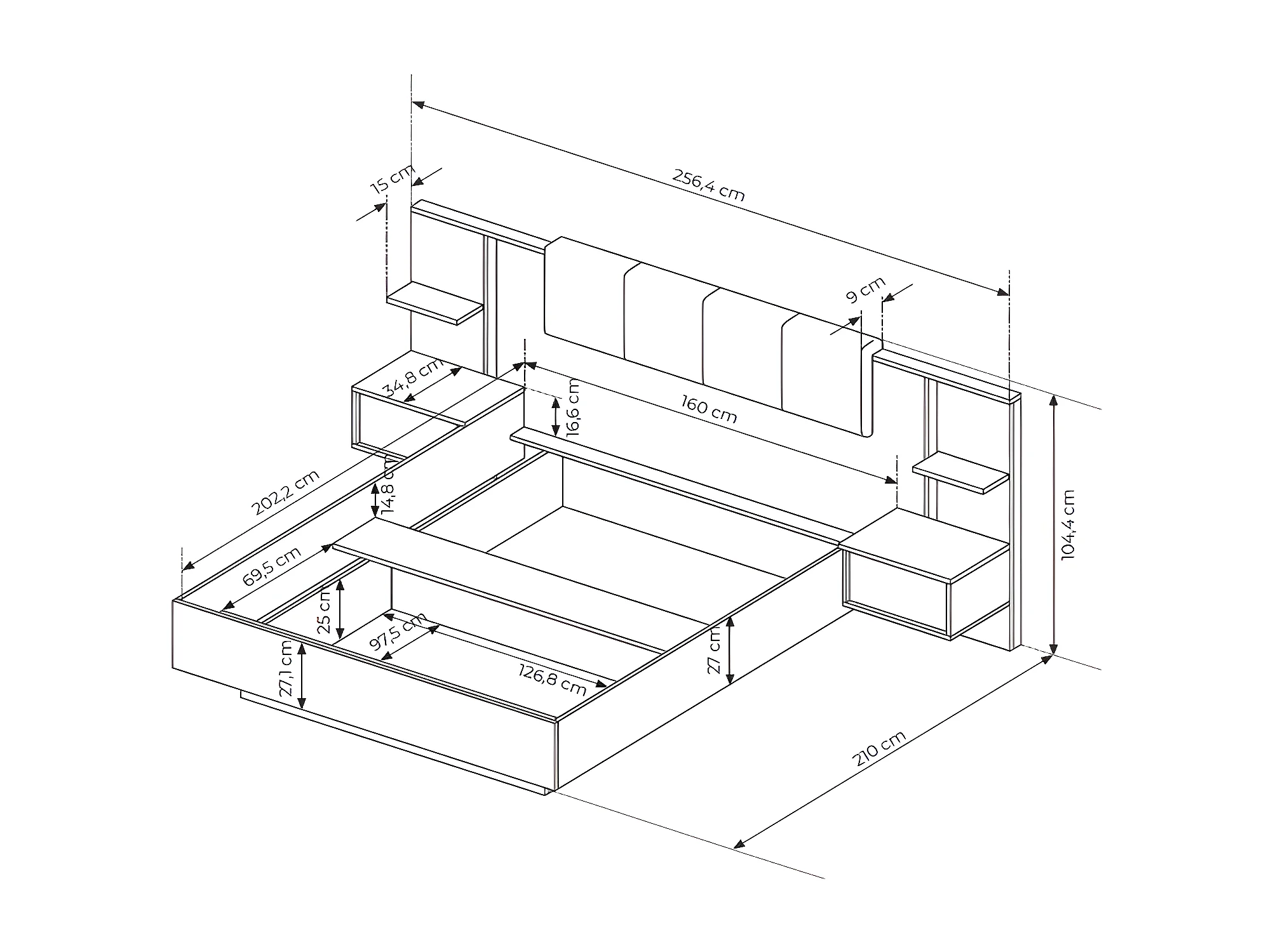 Bed met nachtkastjes 160 x 200 cm - Met ledverlichting - Kleur: naturel en antraciet + bedbodem - ELYNIA