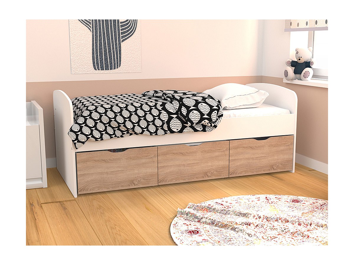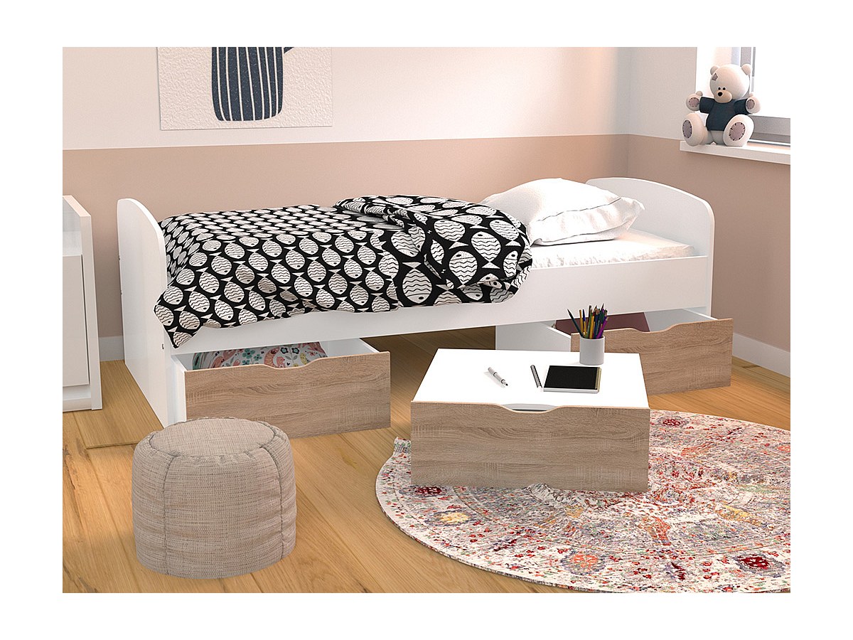 Bed LOUANE met 2 lades en 1 opbergkoffer - 90x190cm - Wit en eik