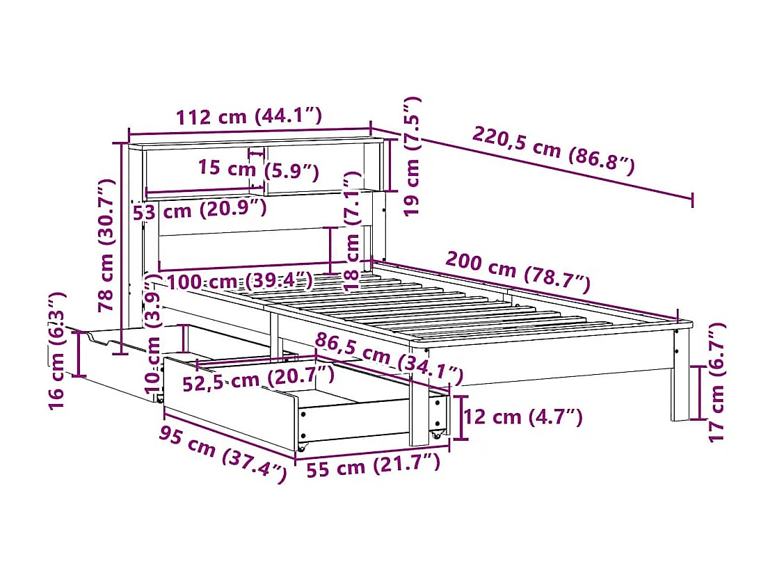Bed met boekenkast zonder matras massief grenenhout 100x200 cm