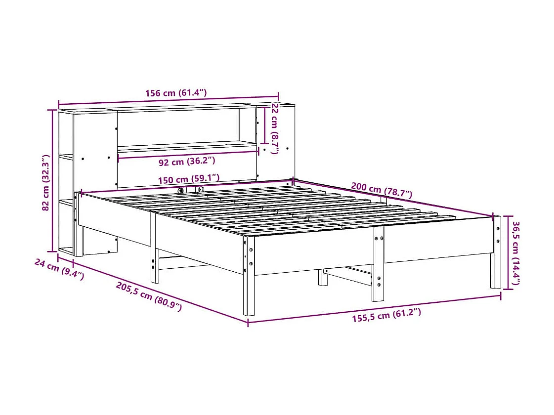 Bed met boekenkast zonder matras grenenhout wit 150x200 cm