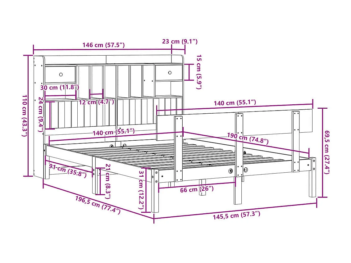 Bed met boekenkast zonder matras massief grenenhout 140x190 cm
