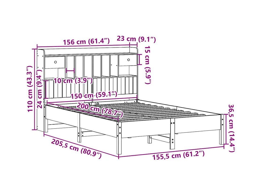 Bed met boekenkast zonder matras massief grenenhout 150x200 cm