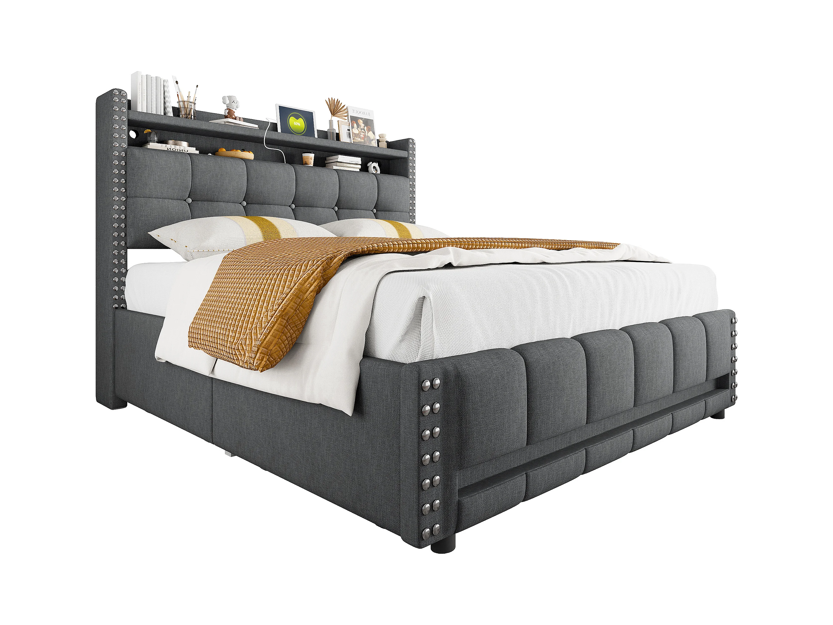 LED Tweepersoonsbed 140x200cm met 5 Laden en Lattenbodem en Hoofdbord, USB/Type C Oplaadpoort, Zonder Matras, Linnen Stof, Grijs
