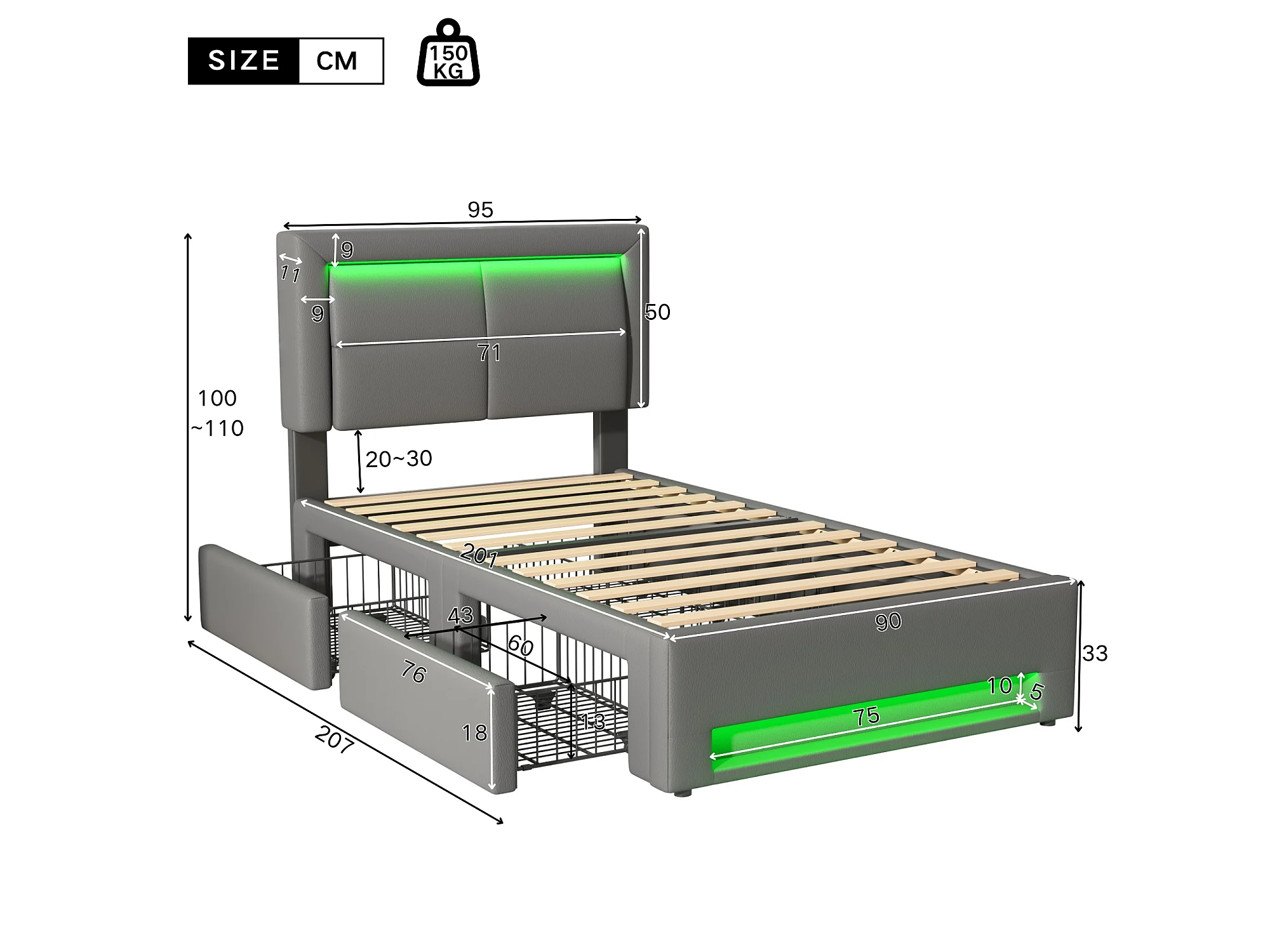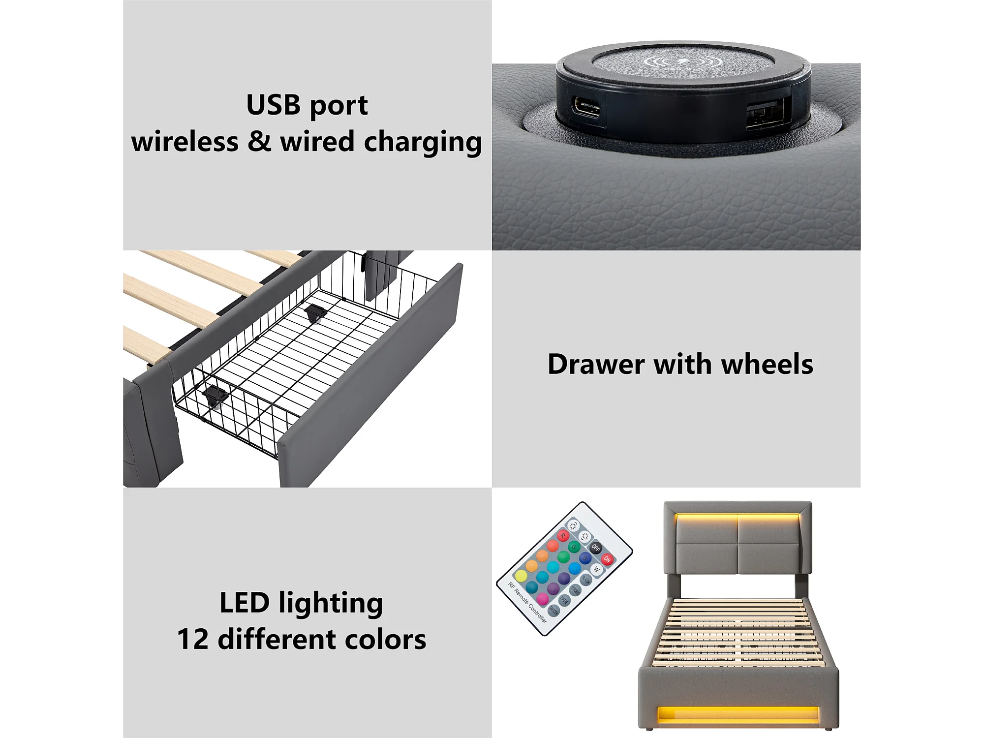Bed met lades 90x200 cm in kunstleer - met LED en oplaadpoorten (bedraad & draadloos) - Grijs