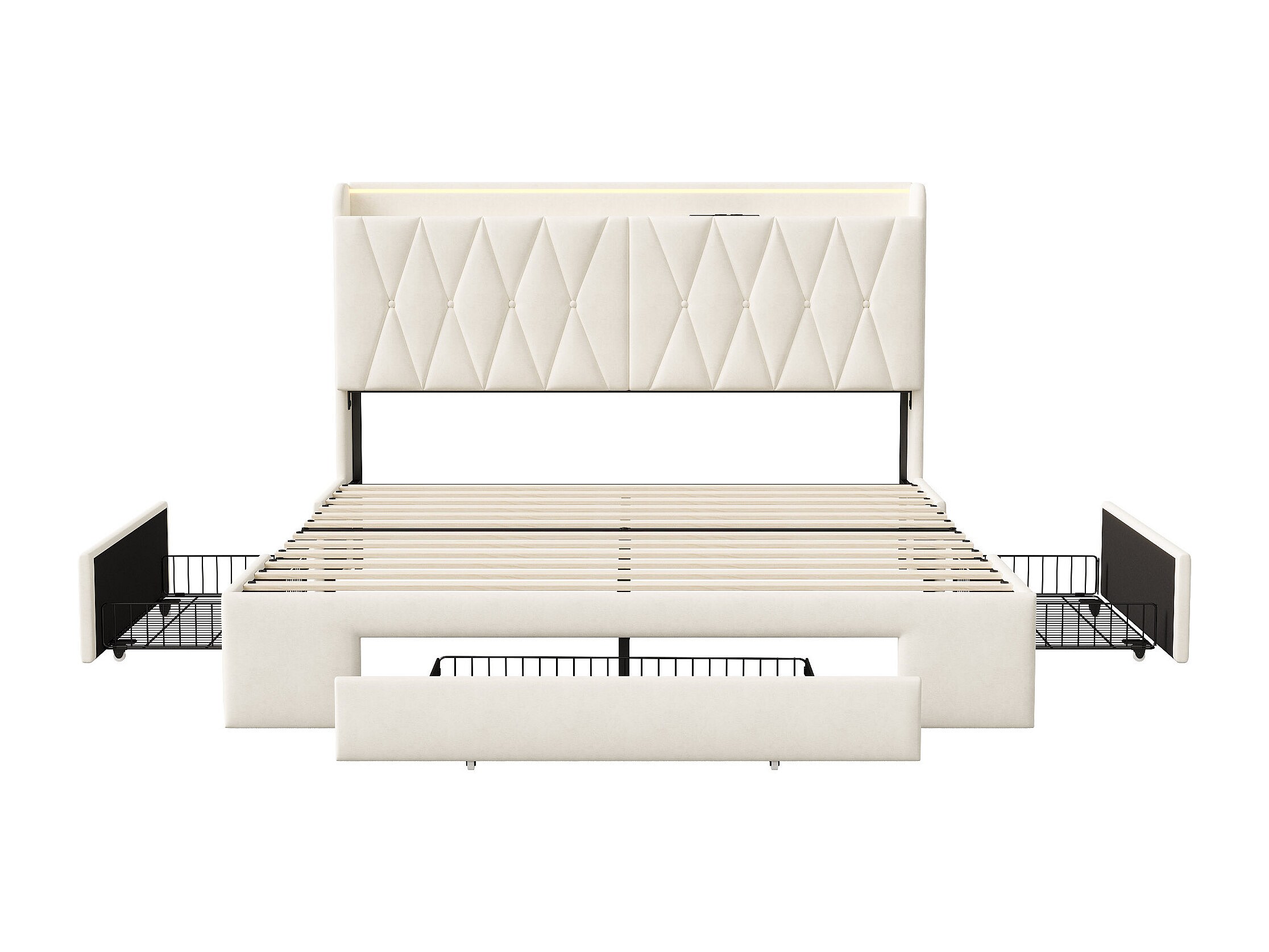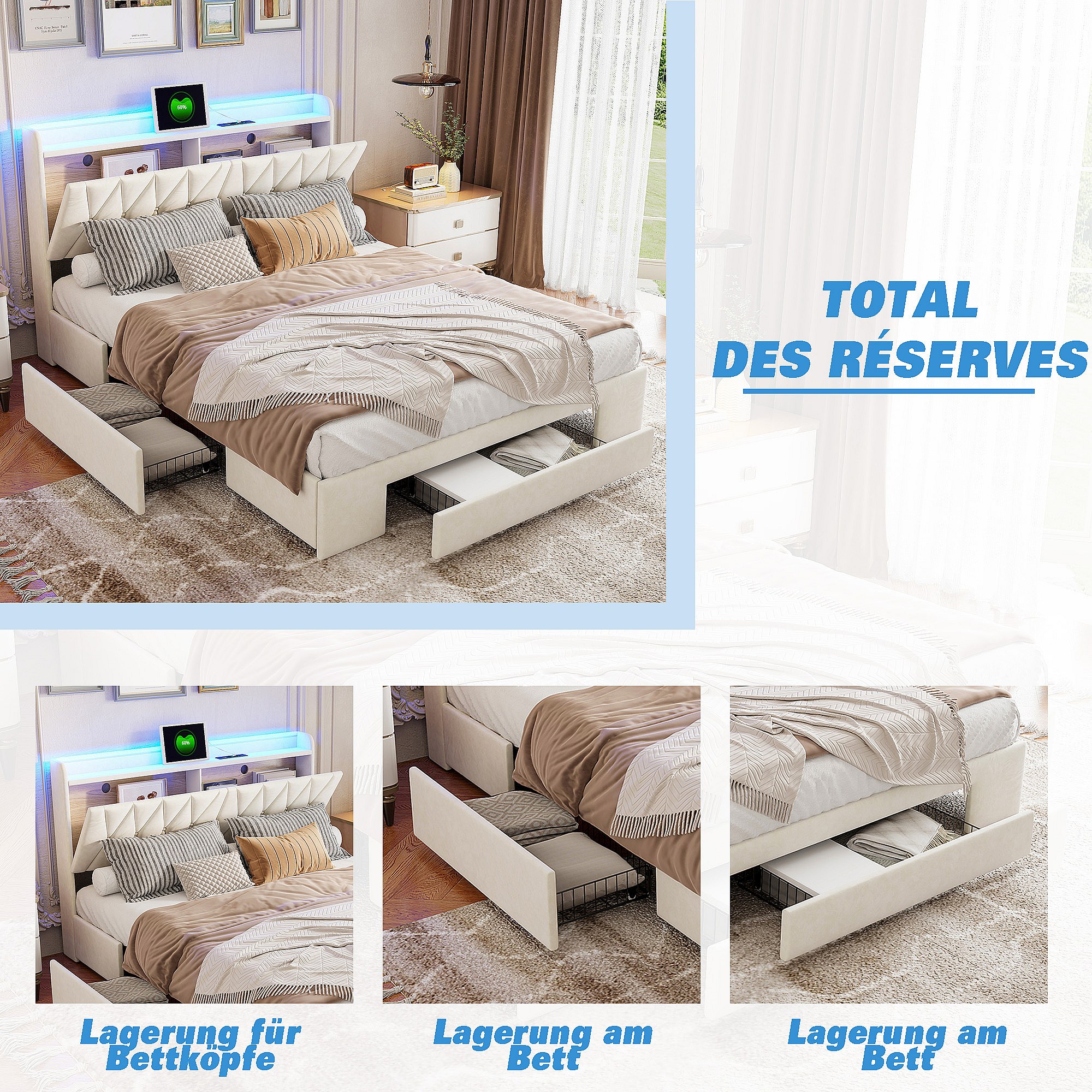 Bed met LED-hoofdbord en 3 opberglades, USB-oplader en RGB-verlichting – 140x190 cm, beige fluwelen design