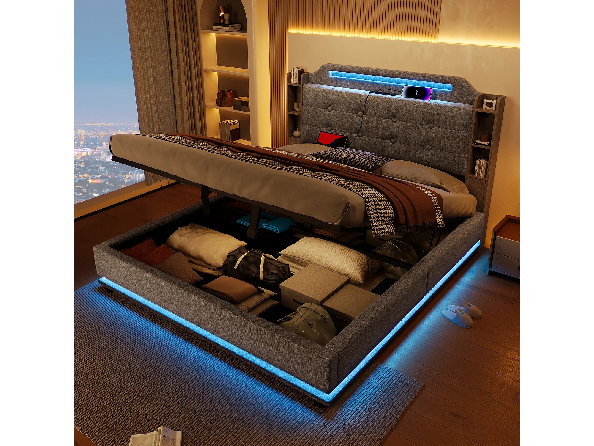 Tweepersoonsbed met USB Type-C, app-gestuurde LED, opbergruimte aan het hoofdeinde, linnen, grijs (161x213x106cm)