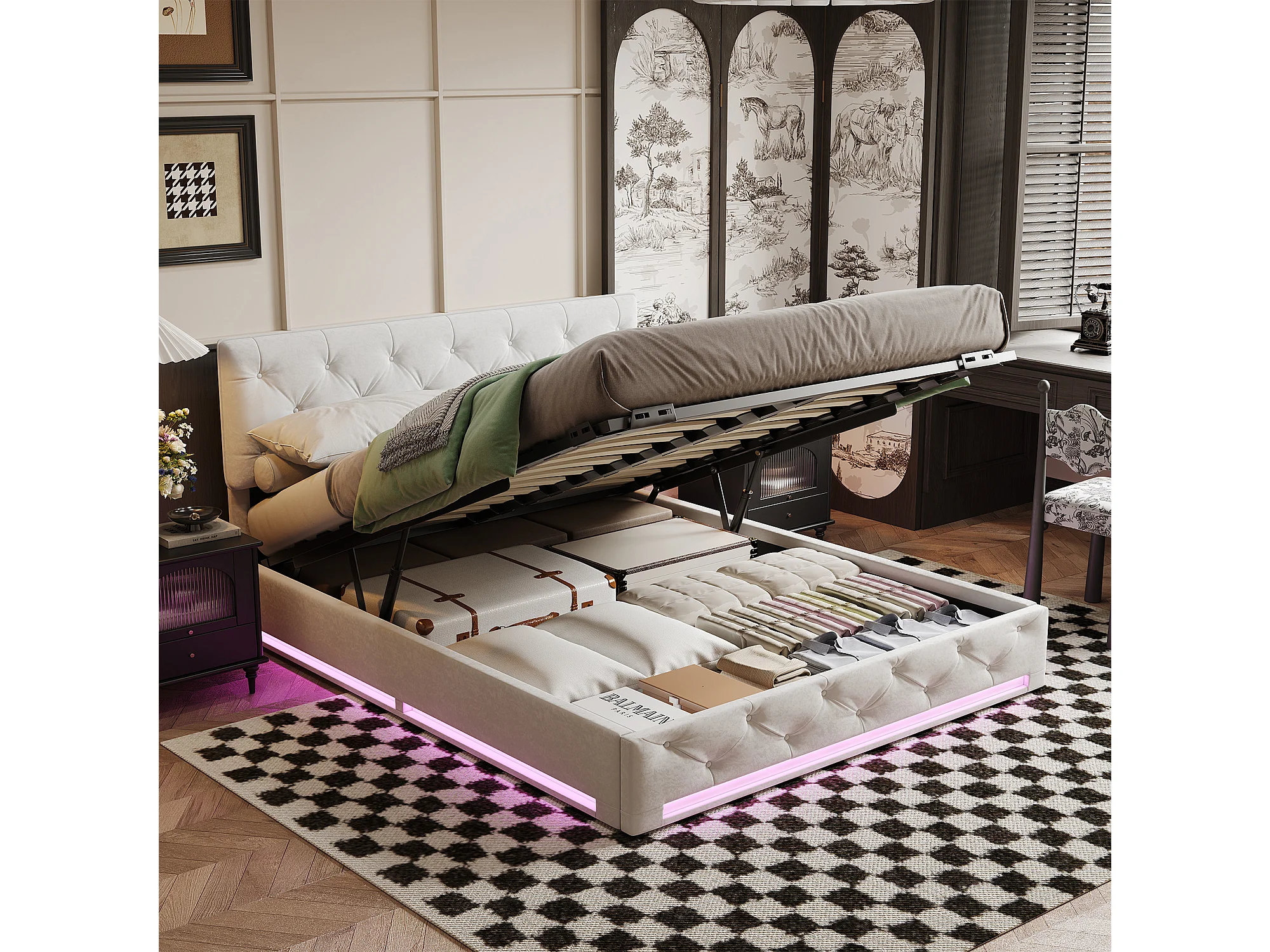 Bed met opbergruimte 160x200 cm, tweepersoonsbed met ledverlichting, springbed met lattenbodem, linnen, beige