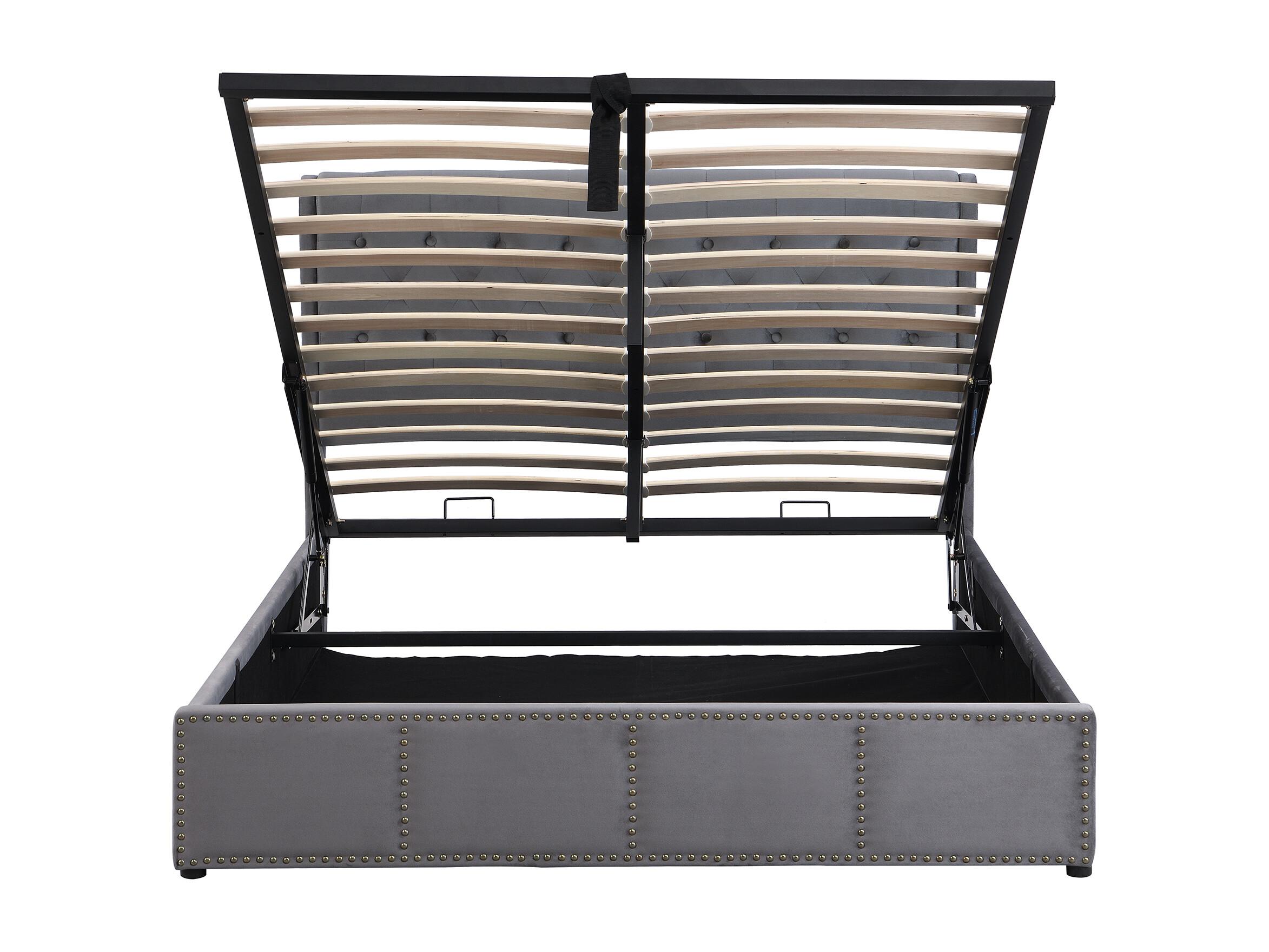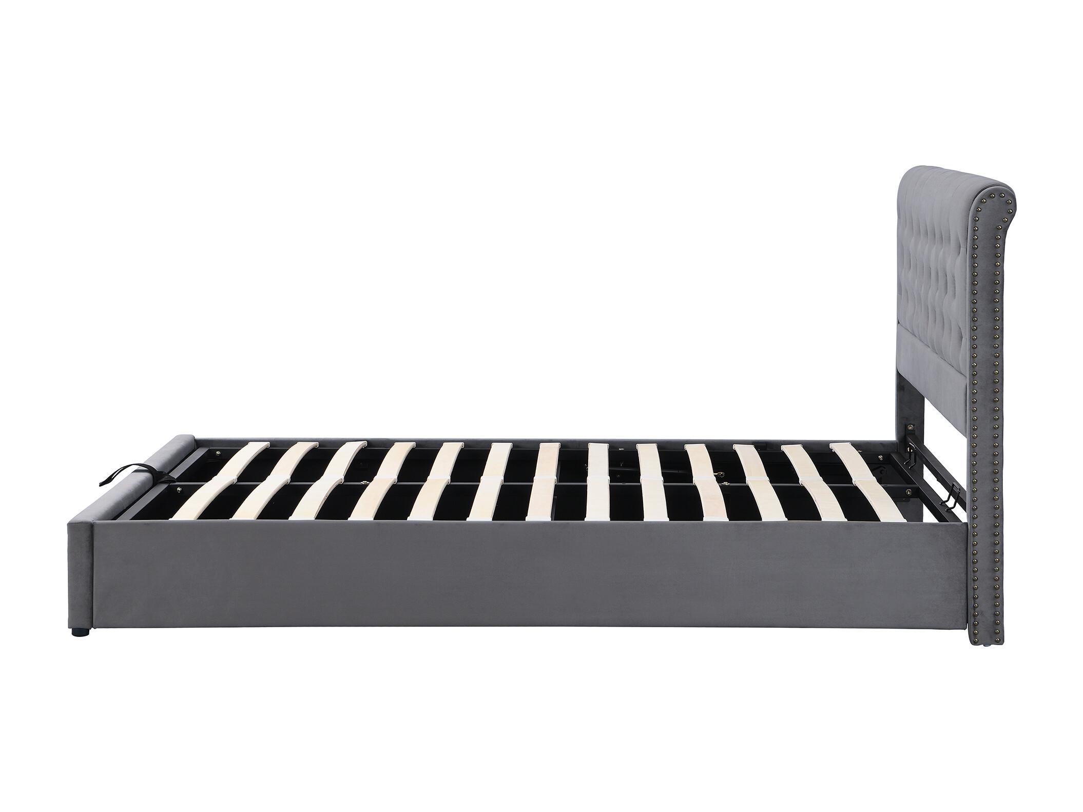 Bed met opbergruimte, hydraulisch, gewatteerd hoofdeinde, metaal, fluweel, grijs, (160x200 cm)