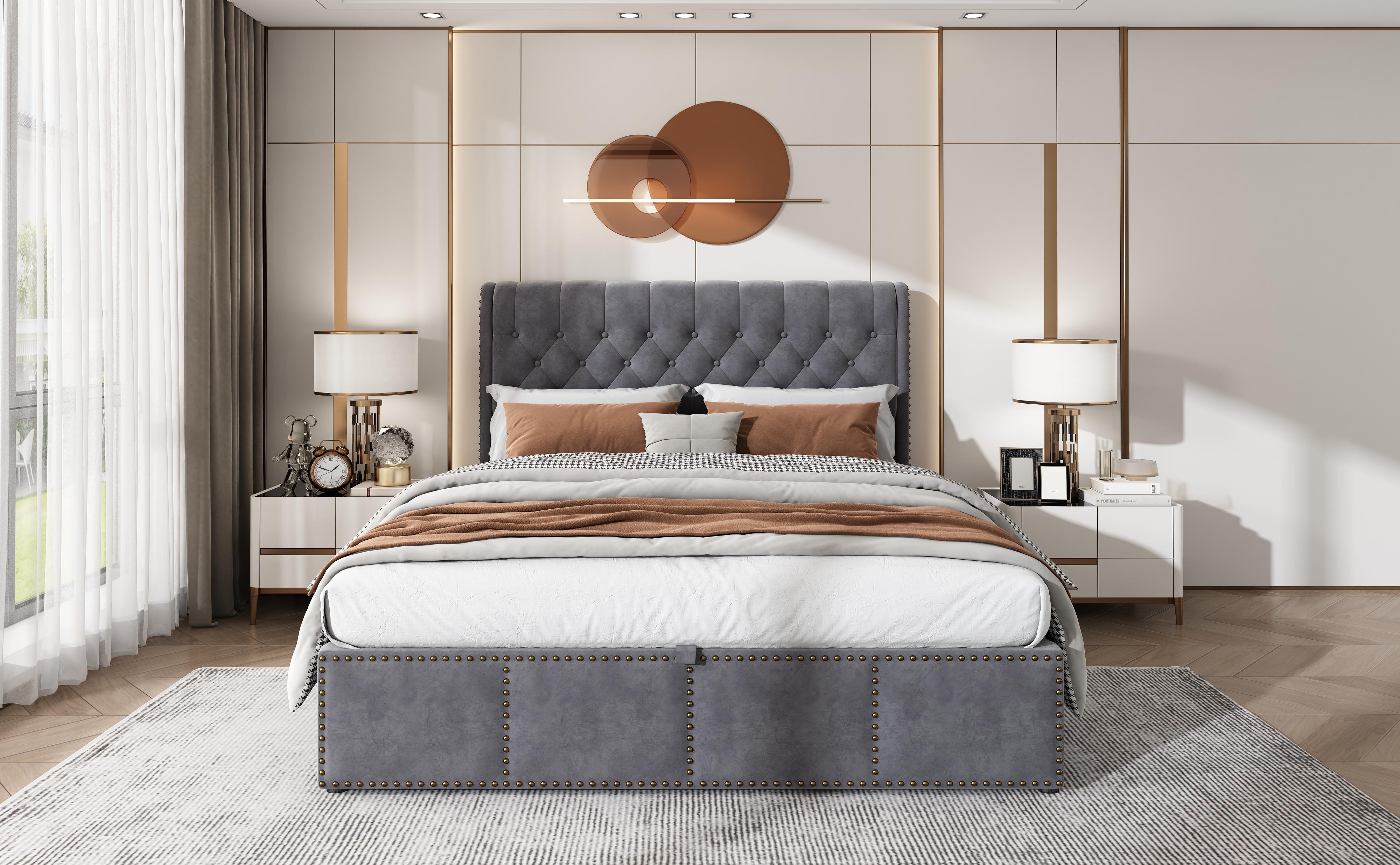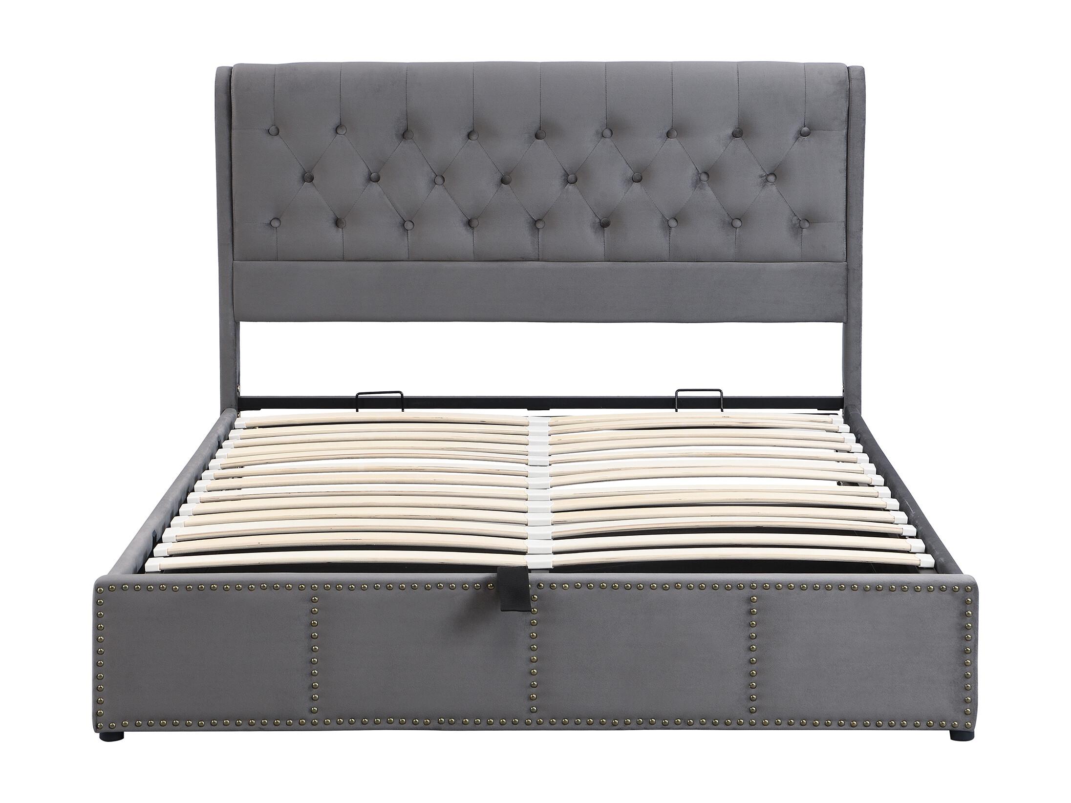 Gestoffeerd kussenvormig bed, fluweel, dubbele rij klinknagels, hydraulische functie met lattenbodem en opbergruimte, 140\190 cm, grijs